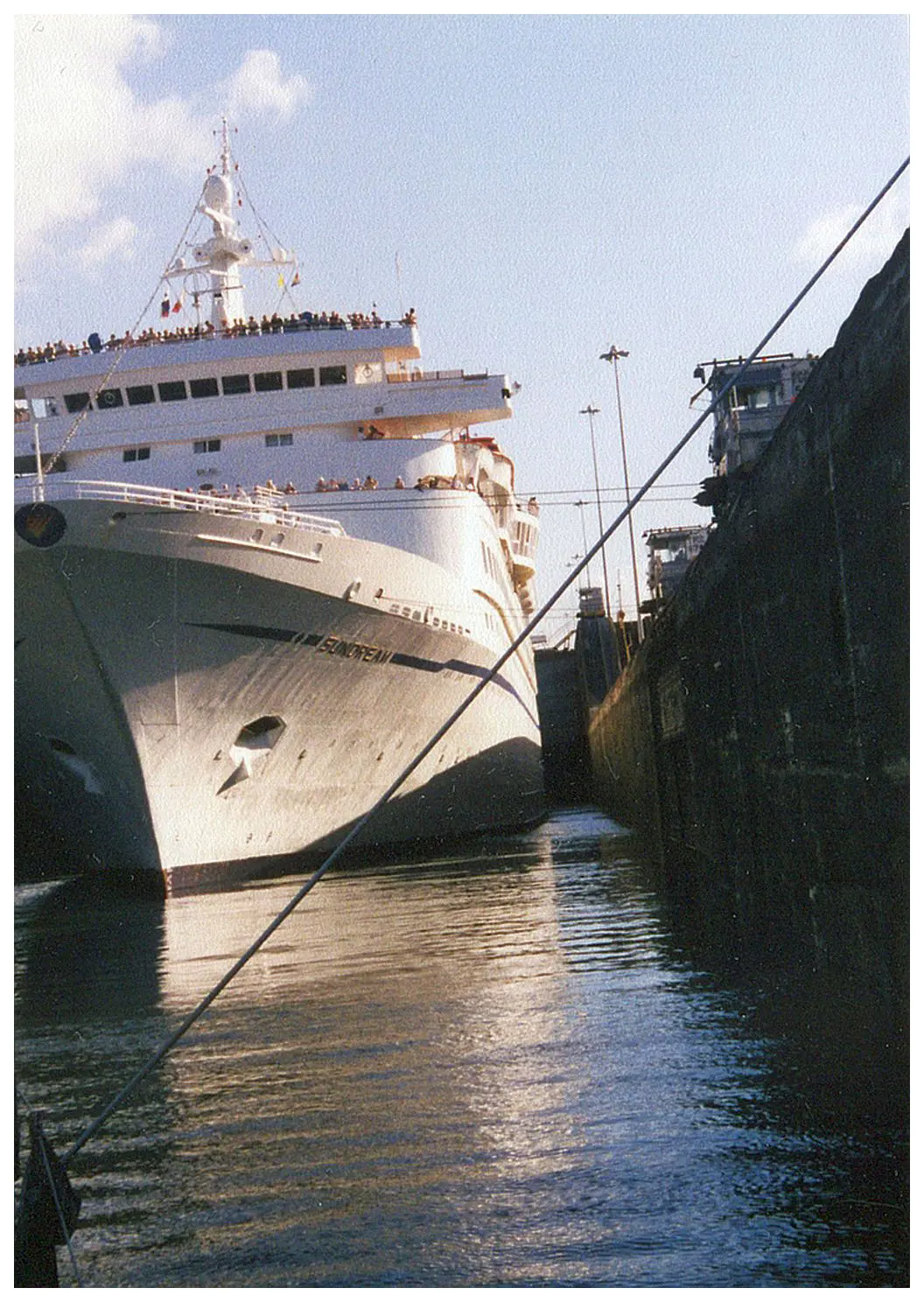 Verwundert stellten wir fest, dass vor uns ein großer Frachter in die Schleusenkammer einfuhr. Uns war klar, dass wir nicht allein die teuren Schleusenfahrten machen können, aber gleich mit solch einem großen Eumel? Alles war bereit, die Linehander auf dem Schiff bestimmt, die Fender (Autoreifen) ausgebracht sowie die vier 40 m-Leinen ordentlich in sauberen Ringen und ohne Kinken aufgelegt, unter der Reling nach draußen geführt und die gespleißten Schlaufen außen über die Reling gehängt. Ich war also jetzt ebenfalls ein Linehander auf einem Handliner, eingewiesen und belehrt, mit Arbeitshandschuhen auf meinem Posten am Bug. An meiner Seite ein dicker blauer Fender für den Notfall und den sollte ich brauchen. Mein Schleusenabitur hatte ich schon auf einer Überführung von Potsdam nach Hamburg in den Schleusen des Mittellandkanals gemacht. Aber gegen die Anforderungen im Panamakanal war das eher die Aufnahmeprüfung für den Kindergarten.