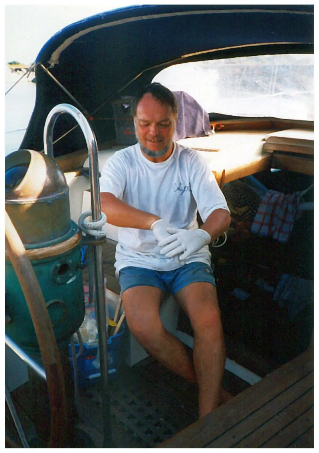 Meine Frau und ich schlummerten ruhig in der achterlichen Koje, wohl wissend, dass keine Gefahr droht, denn Malte stand am Ruder. Da wurde unser gemütliches Zweisammensein (also wir schliefen!) durch einen lärmenden splitterfasernackten Jork gestört, welcher rief: Schnell die Polster weg! Nanu, dachte ich, ist er vorne bei seiner Frau rausgeflogen und sucht sich eine neue Bleibe? Aber der Ernst in seiner Stimme ließ uns schnell zupacken und er verschwand, nachdem die Bodenbretter entfernt waren, kopfüber in Richtung Bilge. Seinen blanken Hintern guckten wir nicht lange an, denn er tauchte schnell wieder auf und zeigte uns die Ursache seines ungewöhnlichen Tuns. Am Heck pläbberte ein Wasserstrahl durch ein kleines Leck leise vor sich