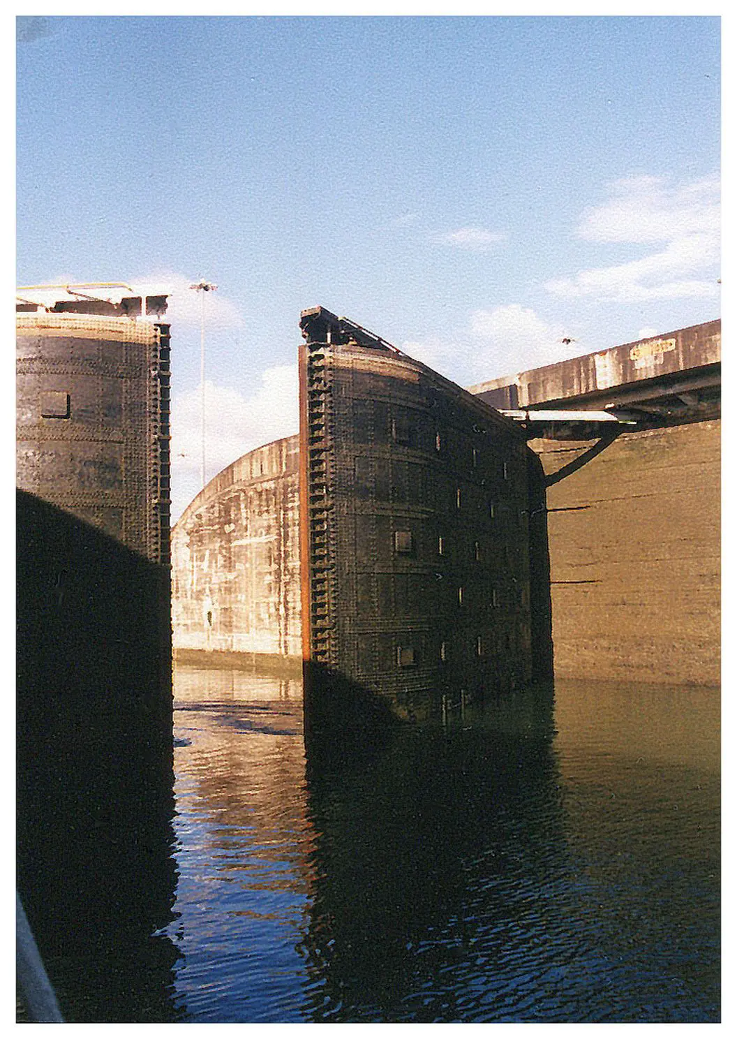 Bevor wir das mächtige Schleusentor passierten, kam von oben ein Pfiff und danach die Wurfleinen der Linhander an Land. Ich zog rechtzeitig meine Birne ein und die „Monkeyfist“ (Affenfaust) knallte aufs Deck. Ich verband die Wurfleine rasch mit meiner Leine. Das Gleiche passierte am Heck. Unsere Linhander an Land holten die Leinen zu sich hinüber, gingen mit dem Schiff mit und belegten oben die großen Poller. Der Panamakanal hatte inzwischen seine 85 Jahre auf dem Buckel und entsprechend sahen die Betonwände der Schleusen aus. Faustgroße Kiesel ragten ausgewaschen aus dem Beton und machten die rauen Kanalmauern zu einem überdimensionalen Schmirgelpapier. Da waren die Autoreifen tatsächlich die richtige Alternative.