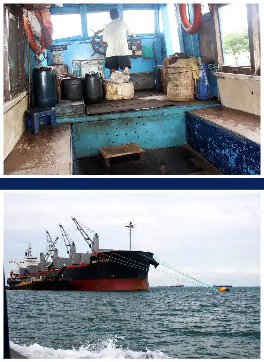 Bild oben: Der Skipper und sein Bumboat. Sehr einfach aber zuverlässig.