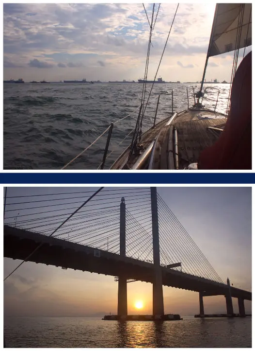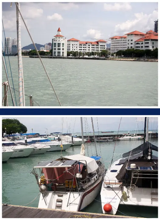 Also war das kein Thema für uns und wir erreichten am Morgen des dritten Tages die Insel Penang. Die alte Tanjong City Marina im Herzen Georgetowns ist jetzt wegen schwerer Verschlammung und schlechter Reparatur geschlossen. Deshalb steuerten wir die Straits Quay Marina an der Nordostküste von Penang an. Erst ging es unter zwei Brücken hindurch, welche die Insel mit dem Festland verbinden. Vor der ersten Penang - Brücke nahmen wir die Genua weg, um freie Sicht zu haben. Franz und Silja kannten die Passage und wussten, dass der Mast genügend Platz zum Brückenbogen hatte. Trotzdem war es irgendwie beklemmend, wenn man das erste Mal unter der Brücke durch fährt und nicht weiß, wie viel Platz noch über dem Masttop ist.
