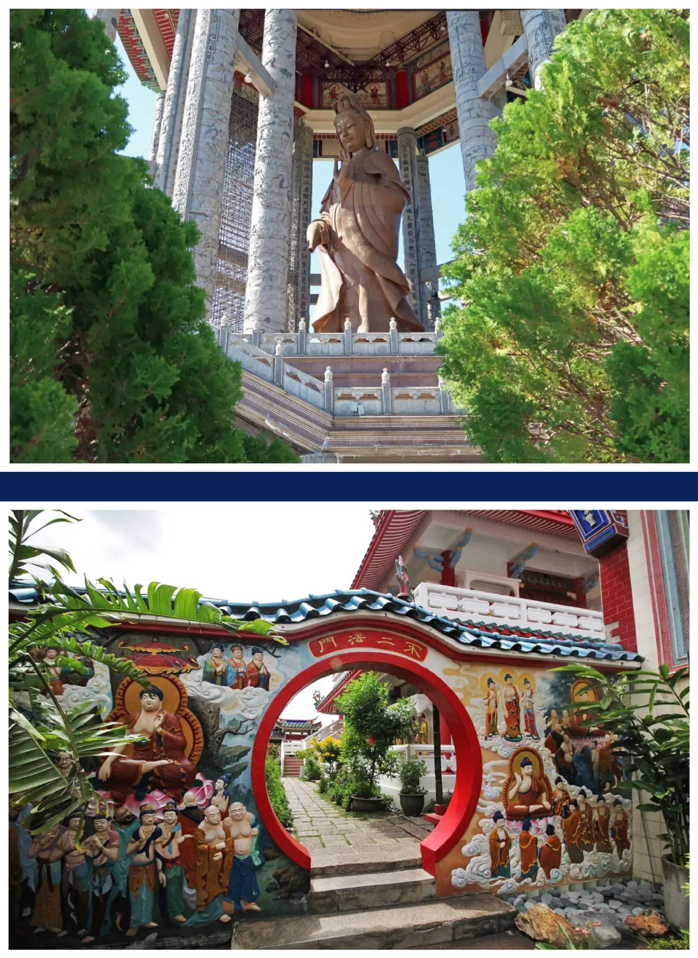 Sein Name lässt sich mit „Tempel des Höchsten Glücks“ übersetzen. Der buddhistische Tempel ist stufenweise auf einer Anhöhe gebaut. Er ist einer der größten Tempel seiner Art in ganz Südostasien. Der Tempel ist sehr sehr farbenfreudig und überall findet man Statuen, Verzierungen, Schreine und auch eine Pagode mit 10.000 Buddhas. Gezählt habe ich sie nicht. Man hat mehrere Möglichkeiten zur riesigen Bronzestatue Kuan Yin, welche den Berg krönt, zu kommen. Die Bronzestatue von Kuan Yin (Guanyin) verkörpert die Göttin der Barmherzigkeit. Man kann den Berg hoch laufen, was wegen der vielen Treppen sehr beschwerlich ist. Dann gibt es eine Gondelbahn, die ist schon bequemer. Man kann auch hochfahren, was wir mit dem Moped machten. Dort hat man einen guten Überblick auf die gesamte Tempelanlage und die Insel Penang. Der Ausblick war schon sehr spektakulär.