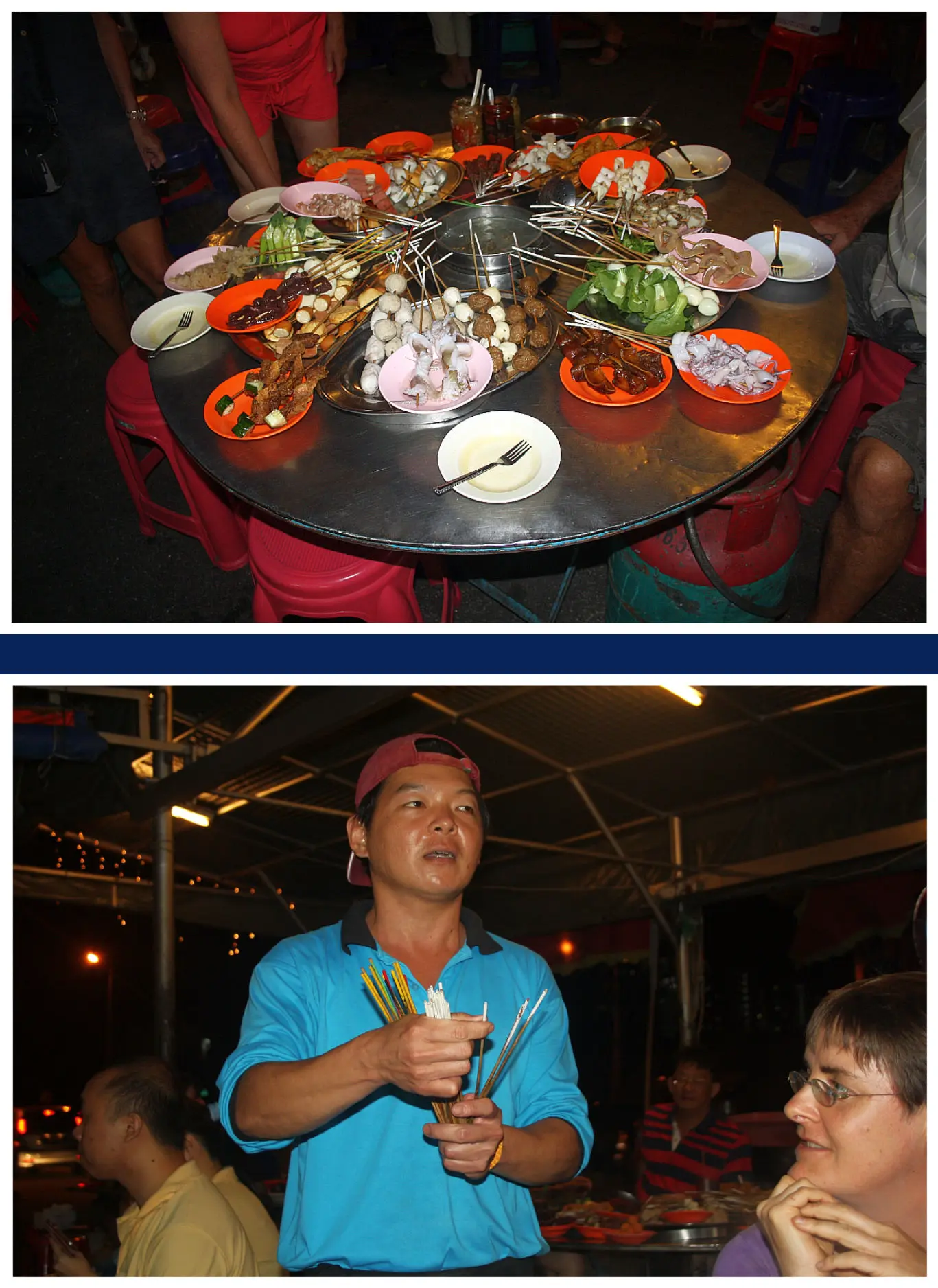 Natürlich begegneten uns beim Besuch der Altstadt allenthalben die schönen Wandbilder von Street-Art-Künstlern. Eine Aktion der Stadtverwaltung, welche Künstler engagierte, um die Straßen von Georgetown zu verändern. Das Ergebnis ist faszinierend. Es wurden nicht etwa die Wände neu verputzt, nein, die Struktur des Hauses, seine Architektur und sein gegenwärtiger Zustand wurden sehr kreativ in die Gestaltung einbezogen. Hoffentlich gibt es, wie bei den Bildern auf der Berliner Mauer, ab und an eine Restaurierung, denn sonst ihr Untergang vorprogrammiert. Schimmel und die hohe Luftfeuchtigkeit setzen dem Untergrund und den Farben mächtig zu. Silja war von den Wandbildern derart begeistert, dass sie an dem Tag, wo die Mopeds gechartert wurden, eine Rundfahrt veranstaltete, bis es finster wurde und mir der Arsch auf dem Moped wehtat. Sehr beeindruckend. Die Wandbilder. Dann ist mir Penangs Street Food in bester Erinnerung geblieben. So das Keat Seng Restaurant an der Jalan Air Hitam bzw. das Seong Garden Cafe. So genau habe ich es nicht herausgefunden, welches von den Restaurants an der Straße für die Präsentation der köstlichsten Speisen verantwortlich ist. Also es war Steamboat, chinesisches Fondue oder Hot Pot angesagt. Diese „Dampfschiff“-Geschichte ist ziemlich einfach und wird wie eine Art Fondue zelebriert. Es gibt mehrere Methoden um das Gemüse und Fleisch zu garen. Die Töpfe zum Garen stehen entweder auf dem Tisch in der Mitte und werden mit Brennspiritus betrieben. Auch gibt es Töpfe, deren Untersatz mit glühender Holzkohle gefüllt, für die die nötige Hitze sorgt. Spektakulär wird es durch den Topf in der Mitte des Tisches, welcher mit Wasser oder einer Brühe gefüllt und mit einem Gasbrenner - die Gasflasche steht unter dem Tisch - am Kochen gehalten wird. Sobald die Brühe kocht, wird lustig alles Mögliche reingeschmissen und nach Belieben gegart und nach weiterem Belieben verzehrt. Ein Essen, bei dem man sich Zeit lassen sollte. Andere Namen für Steamboat sind "Chinesisches Fondue" oder "Hot Pot". In feineren Restaurants wird das natürlich eleganter zelebriert. Ich hatte mir Fischbällchen, Gemüse, dünn geschnittenes Fleisch und Meeresfrüchte ausgewählt. Alles auf Spießen. Diese sind farbig markiert und kennzeichnen den Preis.