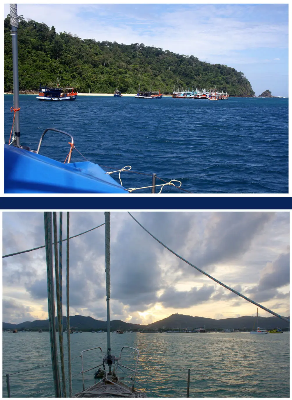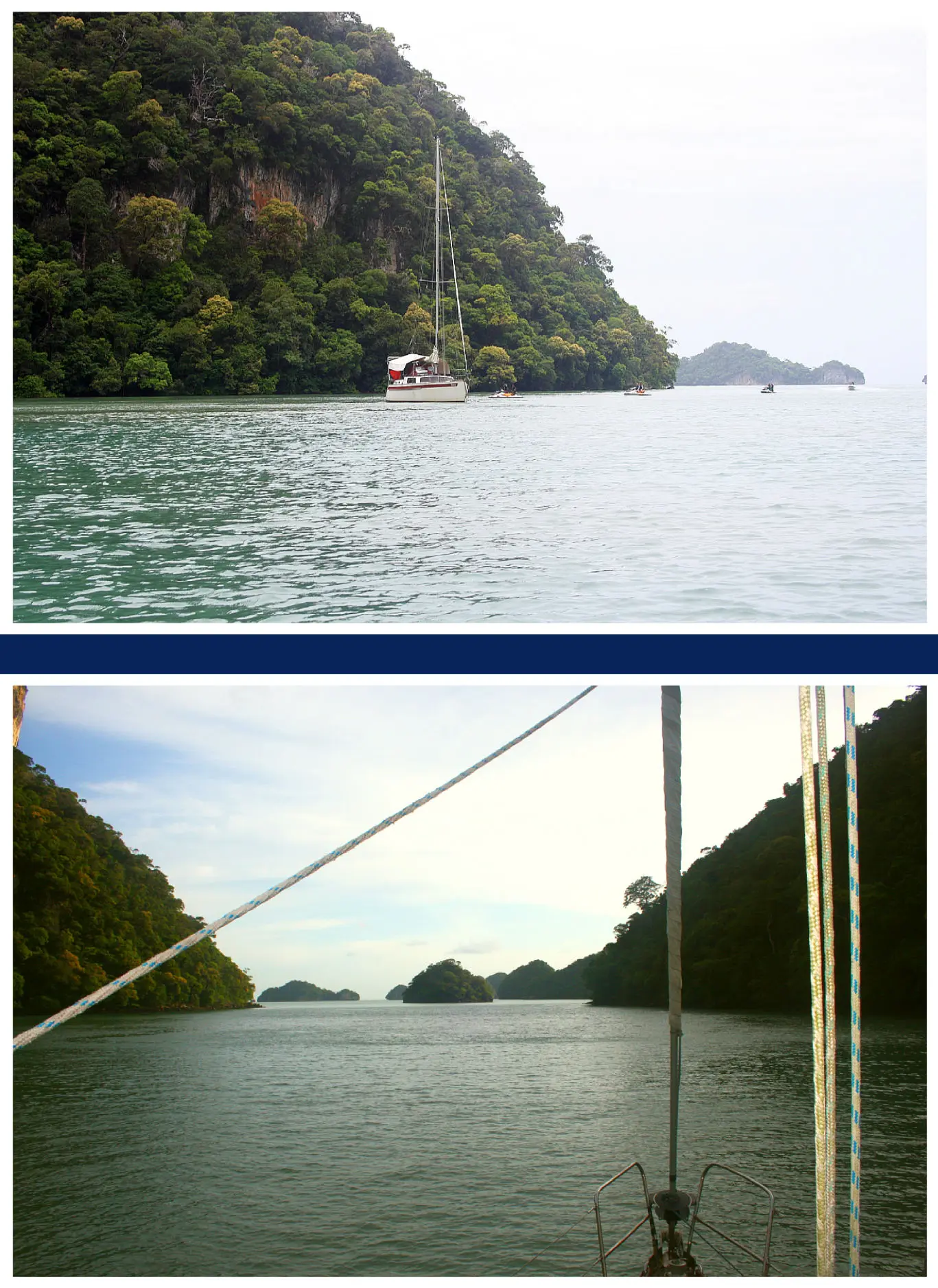 So hüpften wir denn von Insel zu Insel. Nachtfahrten brauchten wir keine mehr zu absolvieren, denn wir hatten Zeit. Die See war der Jahreszeit entsprechend ruhig und wurde nur gelegentlich von plötzlich auftretenden Tropengewittern unterbrochen, welche rechtzeitig durch fernes Grollen aus blau-schwarz verfärbten Wolken Ungemach verkündend und mit peitschenden Regenböen für Erfrischung und Abkühlung sorgten. Oft waren es aber nur gewaltige Wolken aus denen Blitze ihre Fangarme am Horizont ausstreckend Weltuntergangsstimmung verbreiteten. Die Trinkwasservorräte konnten aufgefrischt und die Wäsche, ohne den Wasserverbrauch stark einzuschränken, gründlich gewaschen werden. Wobei letzteres nicht viel Aufwand erforderte, denn was hat man schon bei den tropischen Temperaturen viel anzuziehen. War das Unwetter vorbeigezogen, was manchmal recht schnell ging, strahlte die Sonne wieder mit voller Kraft. Aus den Schluchten der umliegenden Berge quellen Nebelschwaden und lassen die Wälder dampfen. Nach vielen schönen Erlebnissen mit Mensch, Tier und Natur brachte uns der Südostpassat weiter zu einer weiteren ruhigen Insel, die Dank der strengen Regeln in den malaysischen und thailändischen Nationalparks und trotz des ausufernden Tourismus überall zu finden sind. Dazu gehört auch die Ko Tarutao, welche zum Tarutao National Park gehört. Wir befinden uns jetzt schon in Thailand. Eine Insel mit spektakulärer Vergangenheit. Diente sie doch als Gefängnisinsel, deren Bewohner, Gefangene wie Bewacher, da kein Nahrungsmittel-Nachschub während des Zweiten Weltkrieges vom Festland mehr kam, am Verhungern waren. Bald wurden Wachen und auch Gefangene zu gefürchteten Piraten in der Straße von Malakka, die Jagd machten auf reich beladene Schiffe. Außer einer großen Betonmole gibt es wenig was an die Vergangenheit erinnert. Ein Museum ist im Bau, aber da offensichtlich kein Baumaterial oder kein Chef da war, gingen die Werktätigen dort Angeln. Wie ein Mahnmal steht neben dem Anleger ein riesiger Fels majestätisch aus dem Meer ragend. Der Ko Mak Lok, unter dessen überhängenden Felsen, sich Moken (Seenomaden) ihr Domizil suchten. Wir hatten unseres auch und machten uns nach einer ruhigen Nacht nach den etwa 50 sm nordöstlich gelegenen Inseln auf.