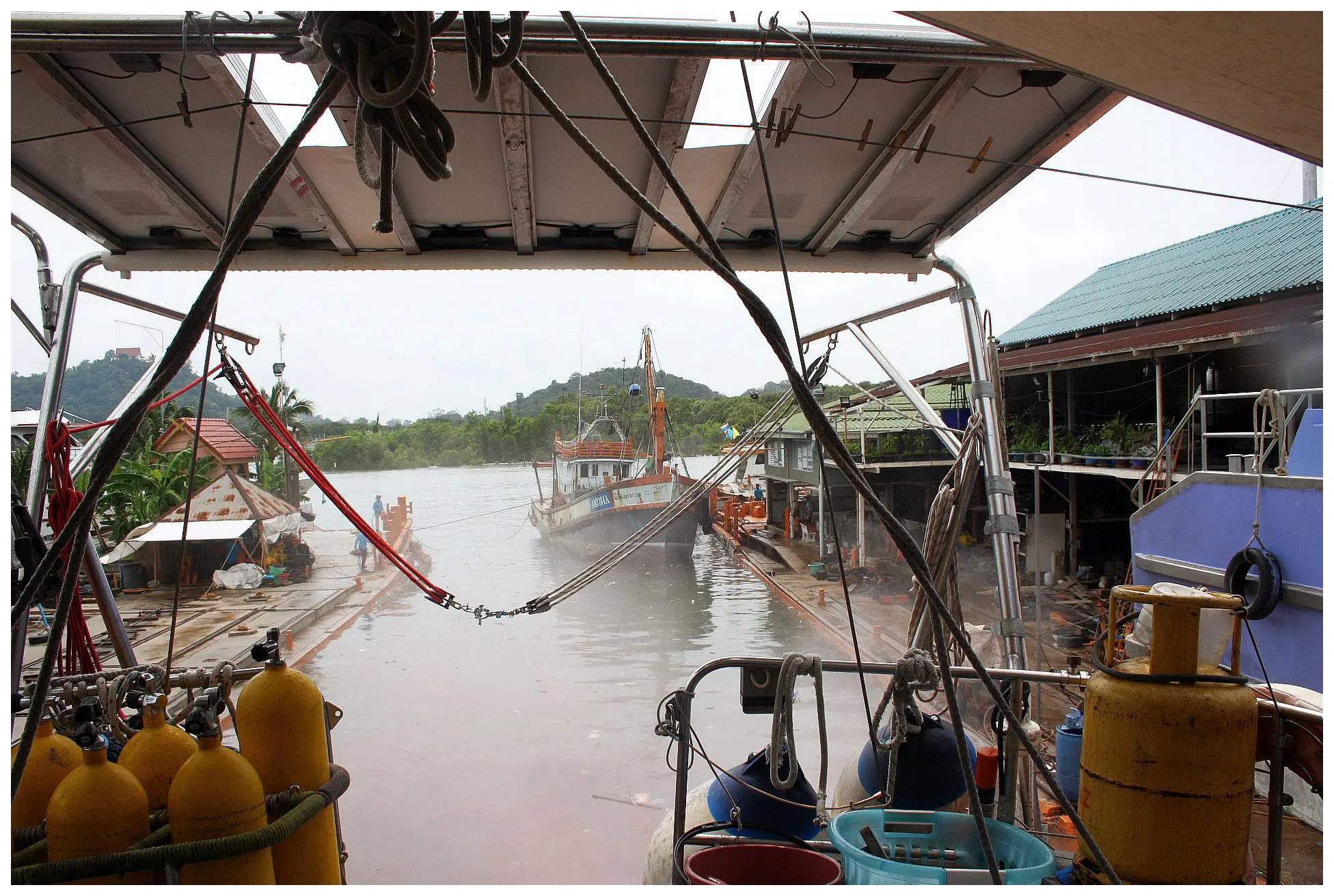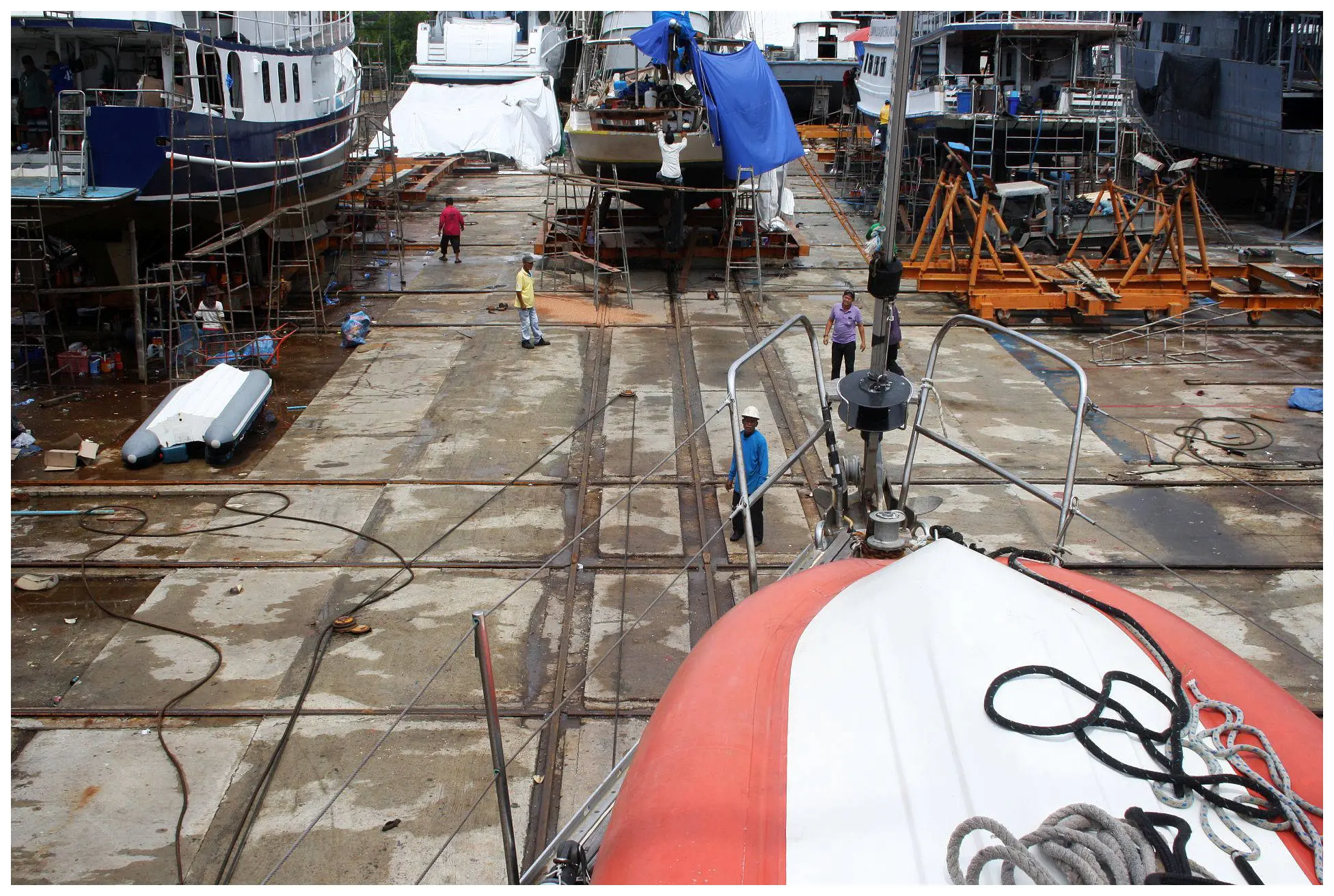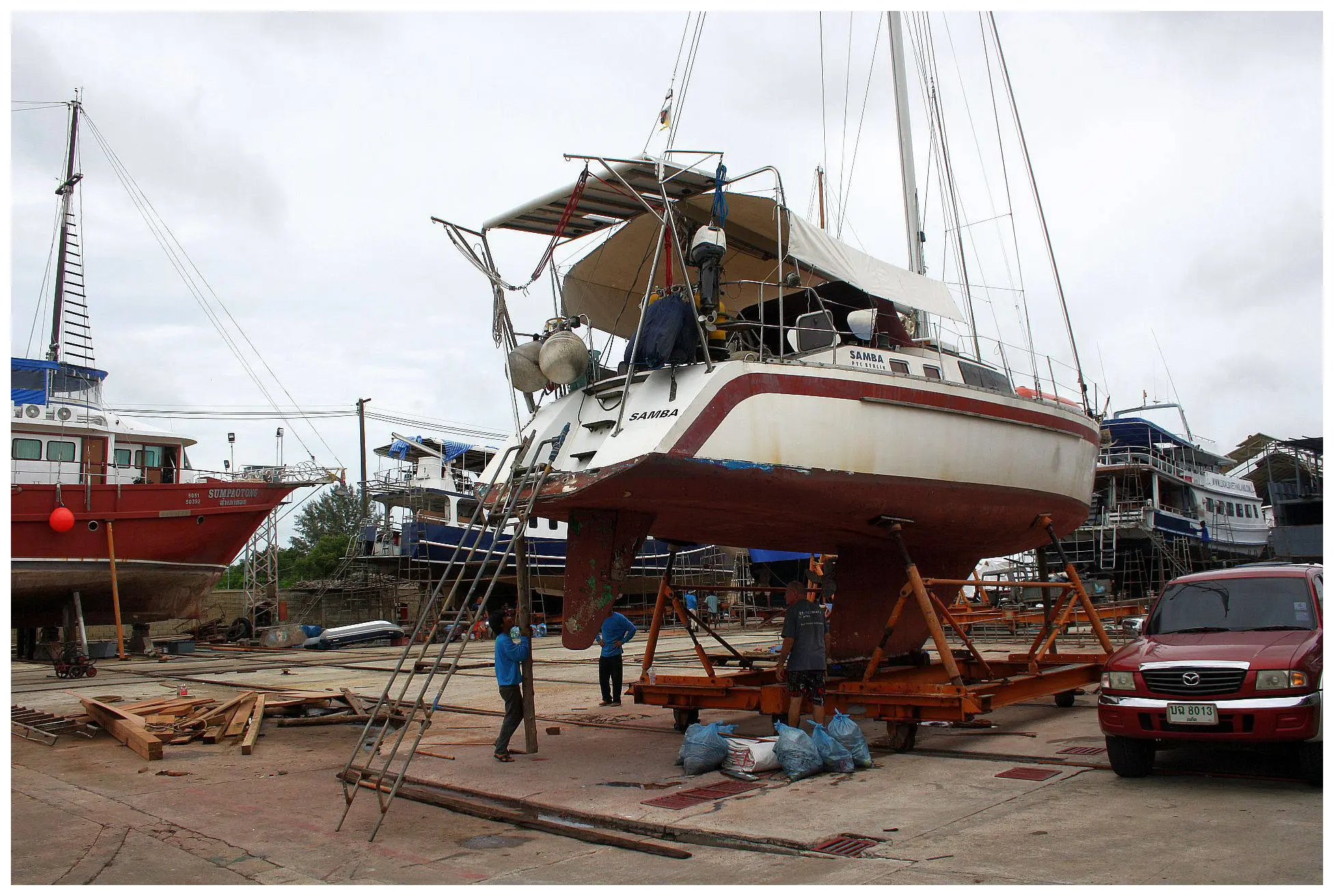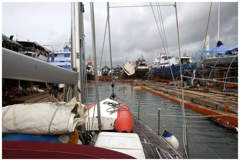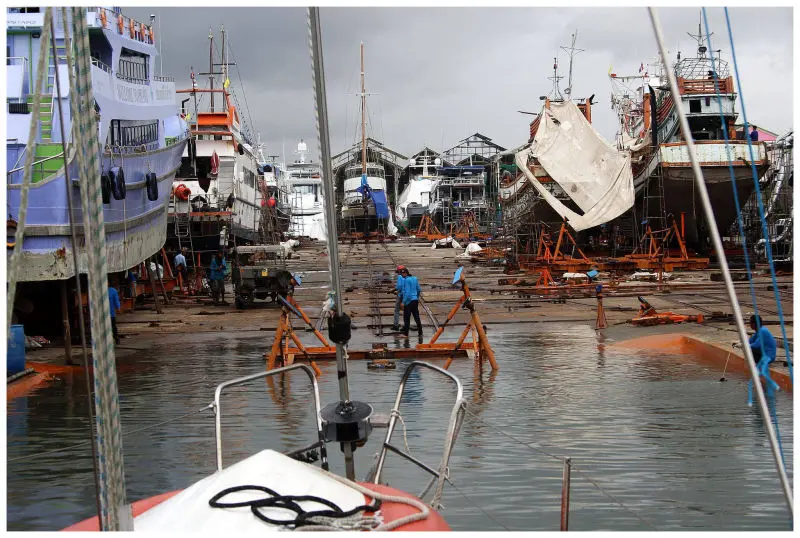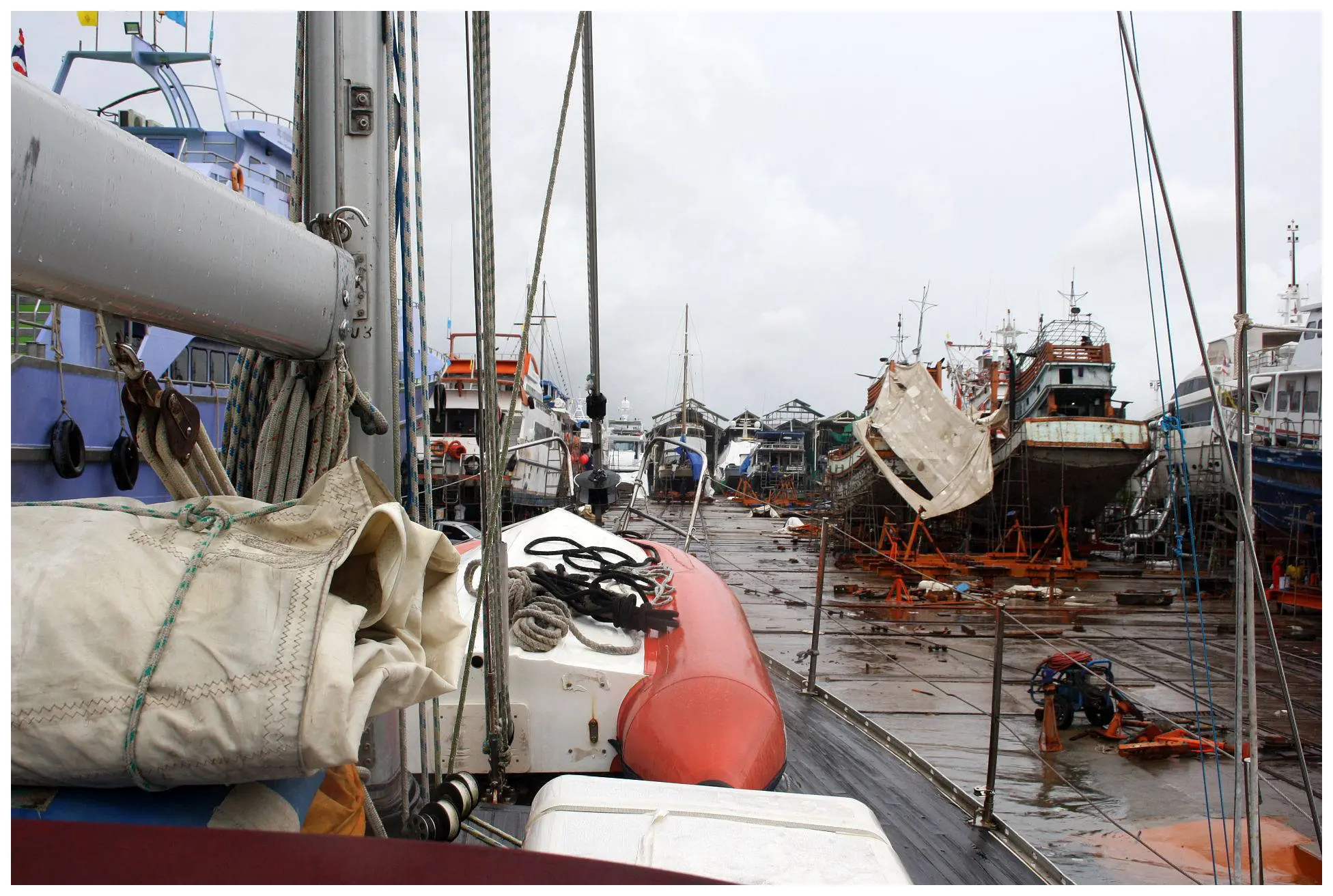 Für Franz und mich begann allerdings eine Zeit, welche weniger vergnüglich war. Es galt das Schiff für den Werftaufenthalt vorzubereiten und es begann eine Zeit des Aufräumens, Sortierens und Packens. Alles musste vom Schiff und irgendwo eingelagert werden. Die leeren Kartons besorgten wir uns im Supermarkt und es sah nach einiger Zeit aus wie bei der Paketpost. Jetzt hieß es auf einen Platz in der Ratanachai Shipyard warten. Diese Werft liegt direkt am Anfang des Flusses Tha Chin gegenüber dem Fischereihafen. Der Fluss ist an dieser Stelle schon sehr flach und wir rutschten bei Flut gerade noch so vor die Einfahrt. Trotzdem kollidierten wir mit dem schlammigen Grund und die Schraube fing sich dieses und jenes ein. Die Slipanlage war mit Schienen und einem Schienenwagen (Slipwagen) ausgestattet, die mithilfe von Winden bewegt wurden. Da wir angemeldet waren, mussten wir nicht lange warten. Auf ein Signal zum Auswassern hin fuhren wir langsam in den schmalen Kanal zur Slipanlage ein. Linehander an Land nahmen die Festmacher entgegen und hielten das Schiff genau mittig. Der Slipwagen stand schon bereit und wurde unter das Schiff gefahren. Dann sprangen Taucher in die Dreckbrühe und verspannten das Schiff unter Wasser auf dem Slipwagen. Als die Taucher wieder an Land waren, begann der „Landgang“ der SAMBA. Langsam wurden wir auf den sinnvoll angeordneten Schienen zu unserem Stellplatz gezogen und das Schiff dort stabil festgemacht. Später wurde es mit Planen so eingehäust, dass man denken konnte, der Christo hätte es verhüllt. Schräg über dem Fluss lag der Fischereihafen von Phuket und über den wehte auch der sonst kühlende Wind. Aber wie das Fischereihäfen so an sich haben, verbreiten sie auch einen eigenen speziellen Mief. Dieser Gestank plus der hohen Lufttemperatur und Feuchtigkeit machten das Klima in der Werft nicht gerade zu einem idealen Arbeitsplatz.