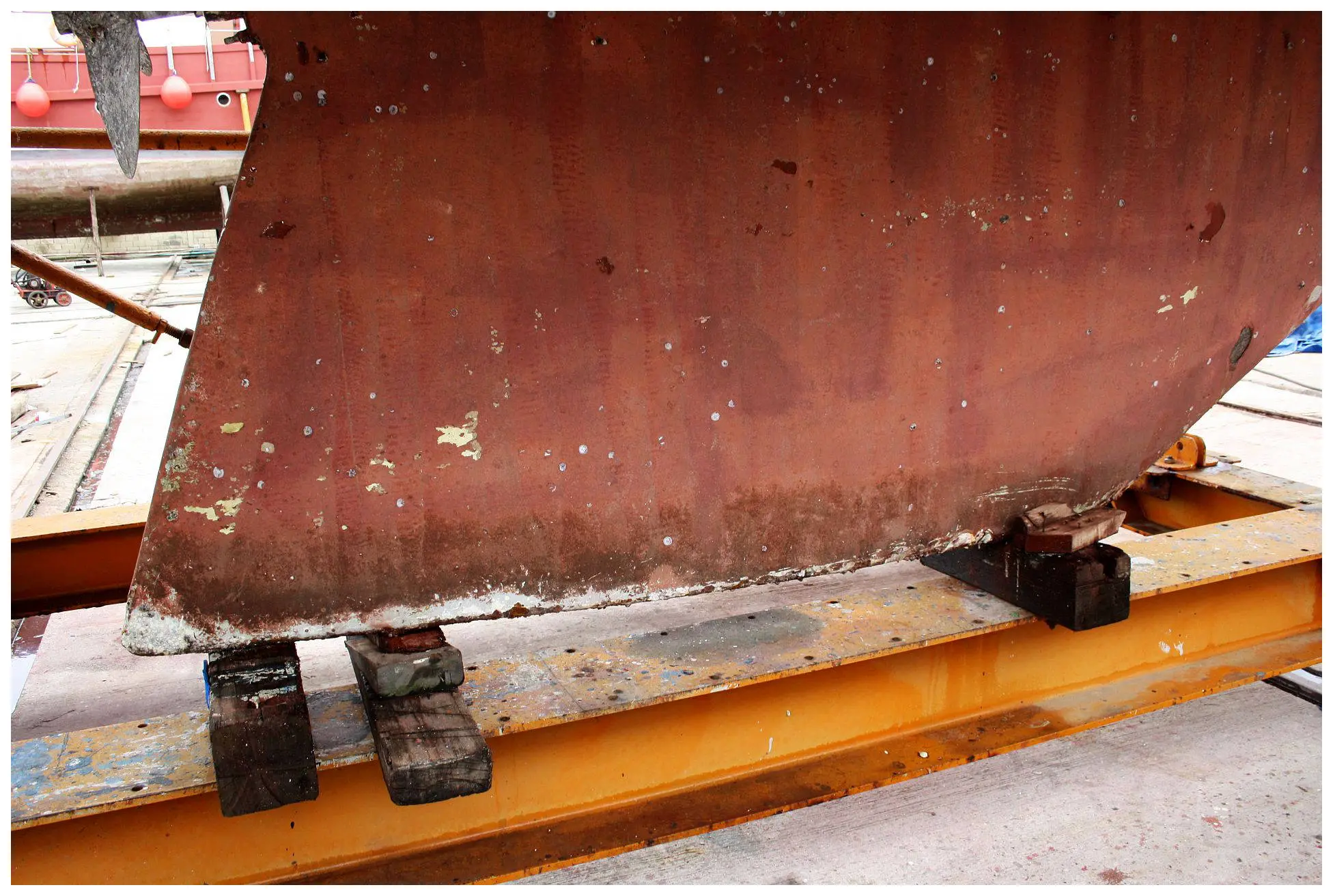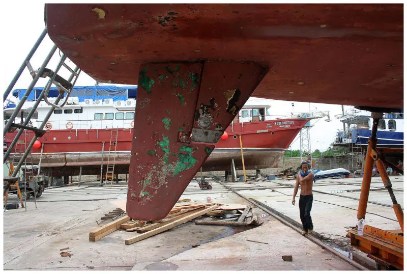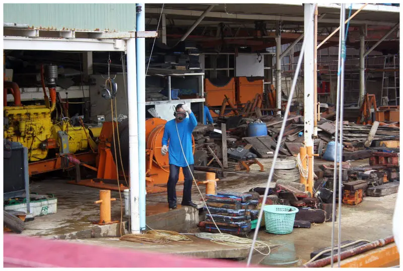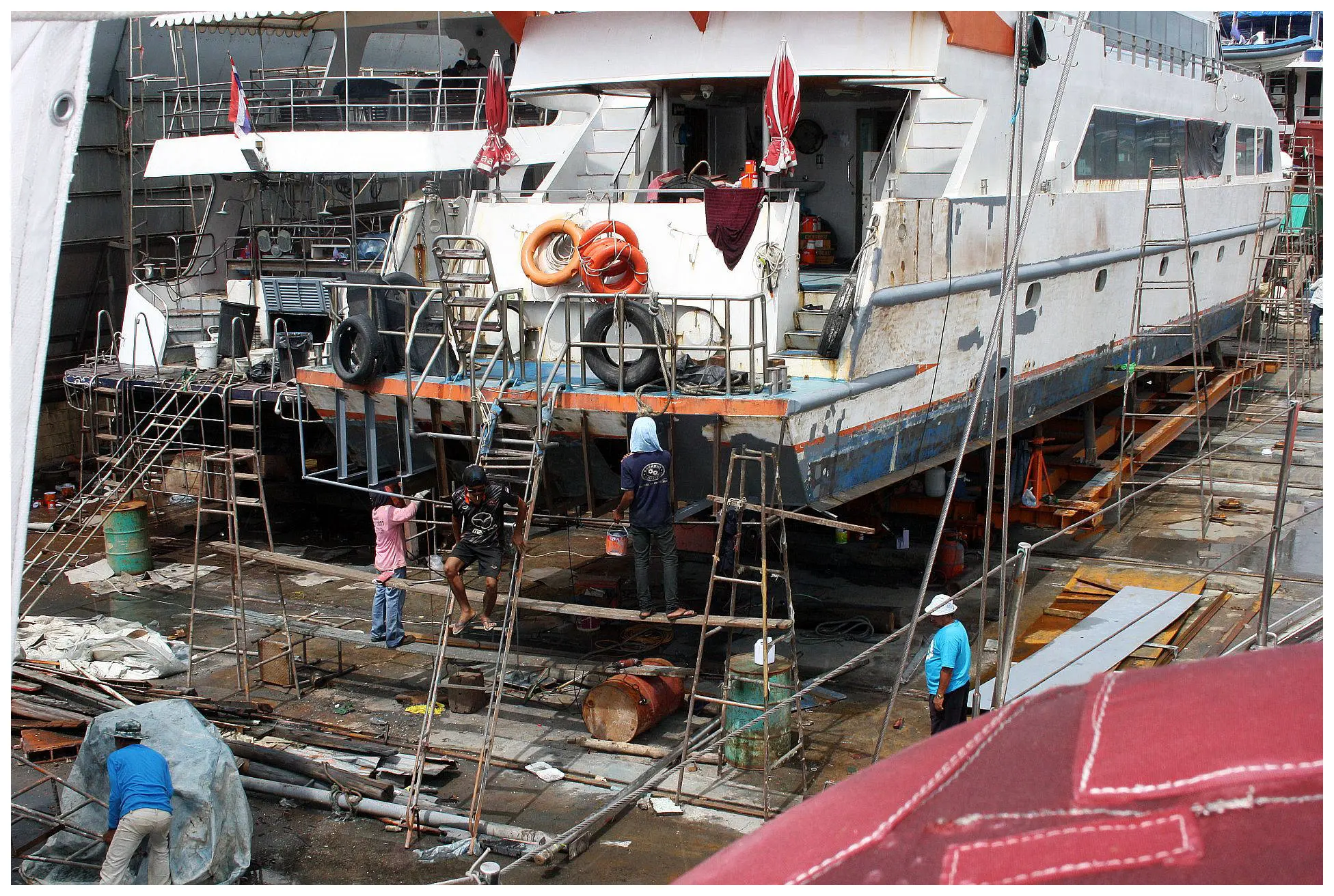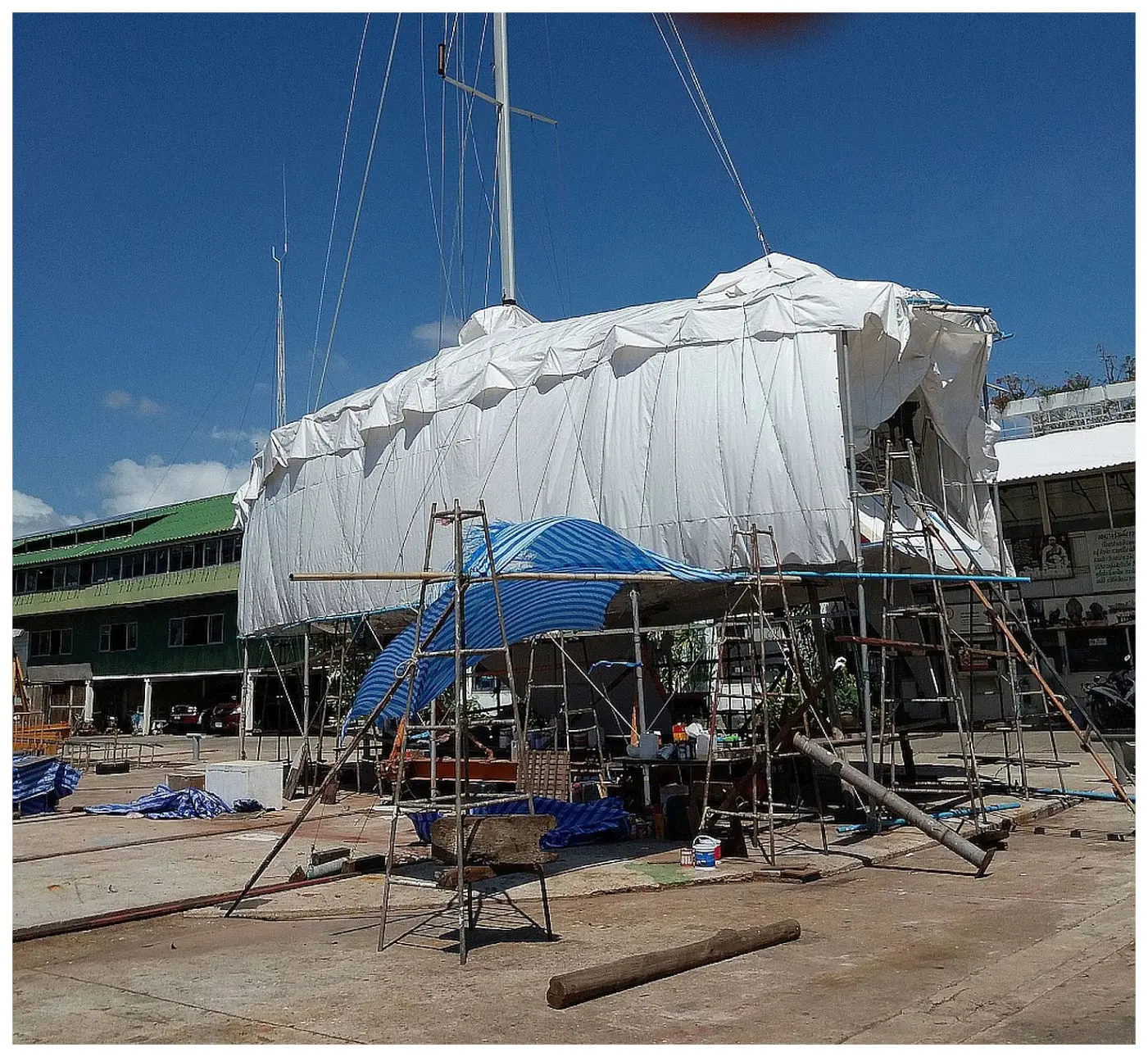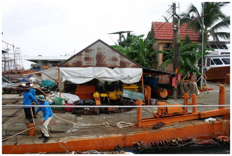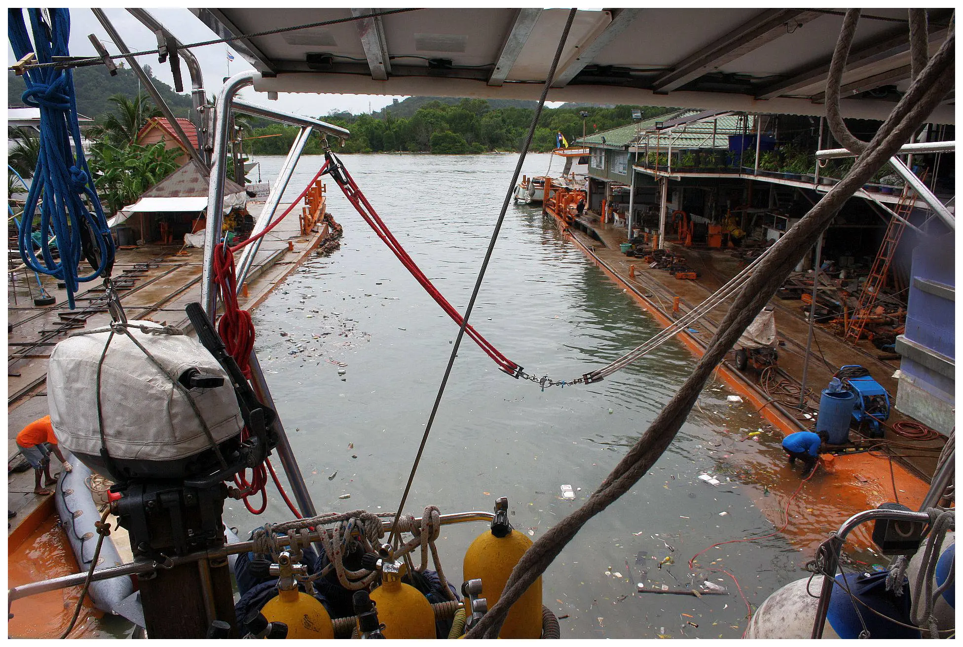 Für Franz und mich begann allerdings eine Zeit, welche weniger vergnüglich war. Es galt das Schiff für den Werftaufenthalt vorzubereiten und es begann eine Zeit des Aufräumens, Sortierens und Packens. Alles musste vom Schiff und irgendwo eingelagert werden. Die leeren Kartons besorgten wir uns im Supermarkt und es sah nach einiger Zeit aus wie bei der Paketpost. Jetzt hieß es auf einen Platz in der Ratanachai Shipyard warten. Diese Werft liegt direkt am Anfang des Flusses Tha Chin gegenüber dem Fischereihafen. Der Fluss ist an dieser Stelle schon sehr flach und wir rutschten bei Flut gerade noch so vor die Einfahrt. Trotzdem kollidierten wir mit dem schlammigen Grund und die Schraube fing sich dieses und jenes ein. Die Slipanlage war mit Schienen und einem Schienenwagen (Slipwagen) ausgestattet, die mithilfe von Winden bewegt wurden. Da wir angemeldet waren, mussten wir nicht lange warten. Auf ein Signal zum Auswassern hin fuhren wir langsam in den schmalen Kanal zur Slipanlage ein. Linehander an Land nahmen die Festmacher entgegen und hielten das Schiff genau mittig. Der Slipwagen stand schon bereit und wurde unter das Schiff gefahren. Dann sprangen Taucher in die Dreckbrühe und verspannten das Schiff unter Wasser auf dem Slipwagen. Als die Taucher wieder an Land waren, begann der „Landgang“ der SAMBA. Langsam wurden wir auf den sinnvoll angeordneten Schienen zu unserem Stellplatz gezogen und das Schiff dort stabil festgemacht. Später wurde es mit Planen so eingehäust, dass man denken konnte, der Christo hätte es verhüllt. Schräg über dem Fluss lag der Fischereihafen von Phuket und über den wehte auch der sonst kühlende Wind. Aber wie das Fischereihäfen so an sich haben, verbreiten sie auch einen eigenen speziellen Mief. Dieser Gestank plus der hohen Lufttemperatur und Feuchtigkeit machten das Klima in der Werft nicht gerade zu einem idealen Arbeitsplatz.