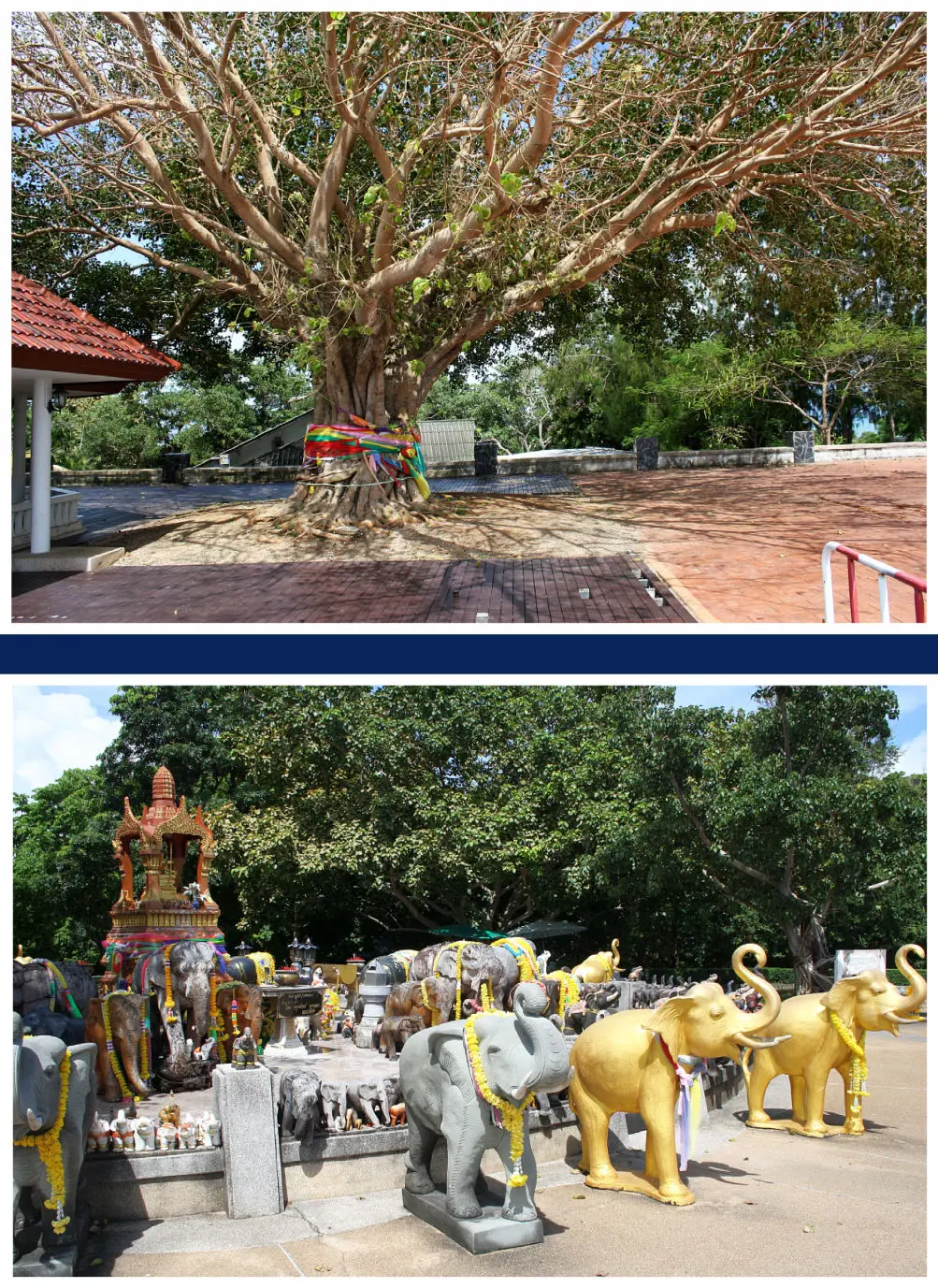 So wie die berühmten Nachtmärkte und prachtvollen Tempel gibt es viele bemerkenswerte Ausflugsziele in Phuket und Umgebung. Es sind so viele, dass man sie alle nicht beschreiben kann. Da ist z.B. der südlichste Punkt von Phuket das Promthep Cape (Laem Promthep). Diese Gegend von Phuket ist ein sehr beliebter Ausflugspunkt, der besonders zum Sonnenuntergang angepriesen wird. Es soll der „berühmteste aller Sonnenuntergänge auf Phuket“ sein. Nun ja, meiner Meinung nach gibt es deutlich bessere und ruhigere Orte und die dazu noch mit einem guten Sundowner. Wir sind dem Ansturm der Tagestouristen auf andere Tageszeiten ausgewichen und haben diesen schönen Ort in aller Ruhe besichtigt. Außer dem historischen Leuchtturm gibt es hier, wie überall, viele heilige Orte und einen weiten Ausblick auf die Andamanensee. Einer dieser heiligen Orte ist ein wunderschön anzusehender Schrein, umgeben von einer Vielzahl von Elefantenfiguren in allen Größen aus Holz oder Stein.
