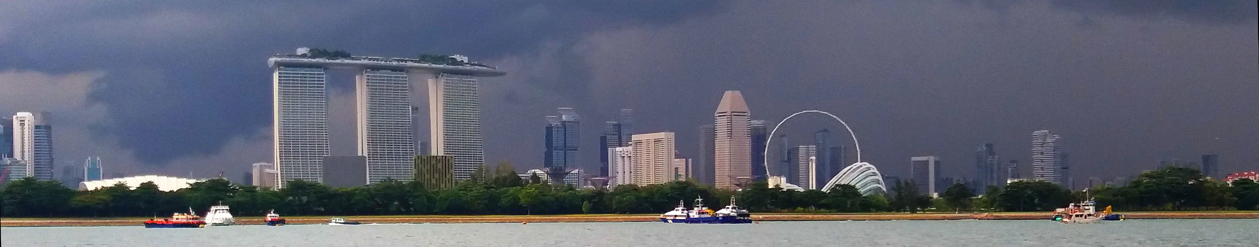 Gut versorgt legten wir an einem sonnigen Morgen und einem guten Frühstück ab. Auf dem träge dahinfließenden Sungai Sebina fuhren wir flussabwärts an Fischzuchtanlagen und der schon bekannten Marina Tanjung Pengileh vorbei in die Straße von Singapur mit ihren hunderten Ozeanriesen aller Art. Unser Blick richtete sich stets auf den Bug jedes Schiffes, ob ein Ankerball bzw. Ankerkette zu erkennen sei und das Teil sich nicht bewegte oder eine Bug- bzw. Heckwelle anzeigte, dass der Riese Fahrt machte. Das AIS war uns beim Slalom zwischen den Schiffen eine große Hilfe. Bei aller Aufmerksamkeit auf den Schiffsverkehr bekamen wir noch eine schöne Belohnung. Da wir zwischen der Stadt und den vorgelagerten Inseln die Singapur Street passierten, erlebten wir ein großartiges Schauspiel. Ein vorbeiziehendes Gewitter tauchte die Skyline in ein dramatisches Licht und machte dem Sonnenuntergang Platz. Hinter Singapur versank die Sonne im abendlichen Dunst der Großstadt. Die Skyline mit den imposanten Hochhäusern und dem alles überragenden auf drei Pfeilern liegendem Schiff des futuristischen Marina Bay Sands Resort, welches knapp 200 m Höhe misst, leuchteten in der Abendsonne, während die Stadt selber schon im Dunkeln verschwand. Das Panorama war schlicht gesagt umwerfend.