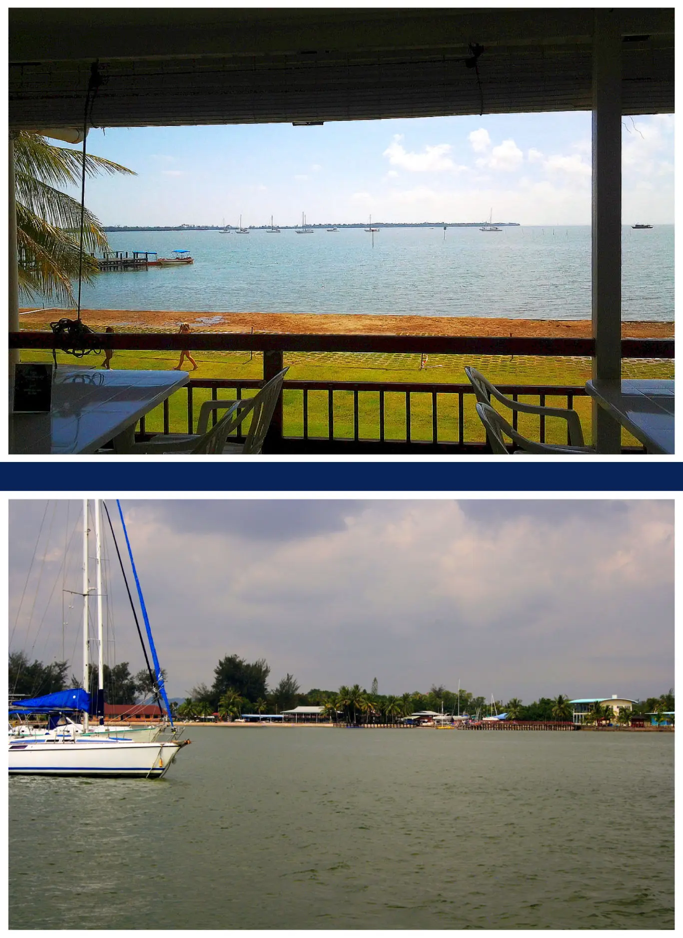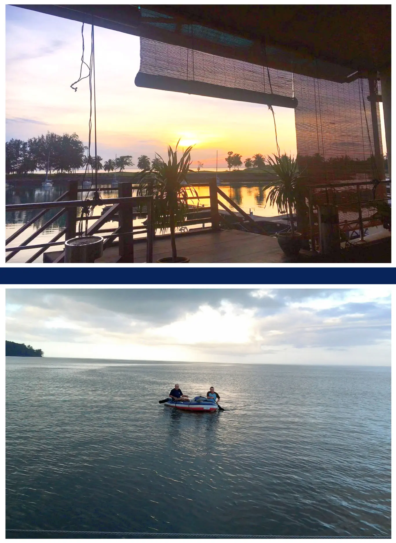 Bild oben: Im Restaurant. Blick über die Marina auf das Südchinesische Meer