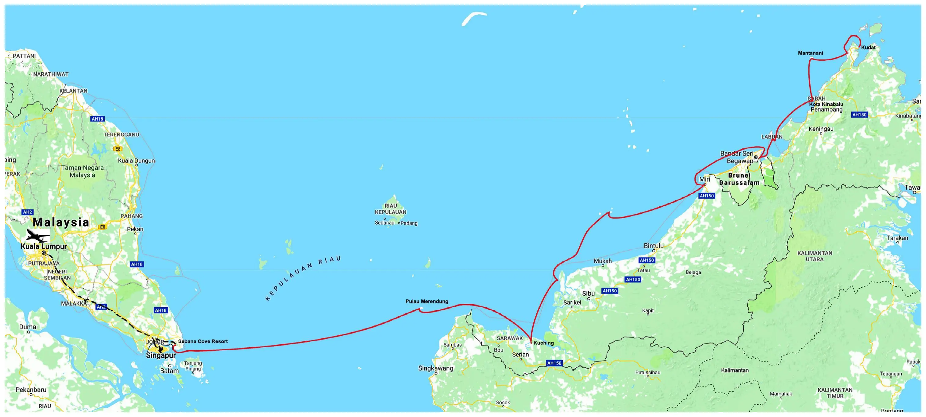 Die Reise von Kudat im malaysischen Bundesstaat Sabah (Borneo) an der Nord-Westküste entlang über Brunei zum Sebana Cove Resort (Malaysia) und von dort über Land nach Kuala Lumpur