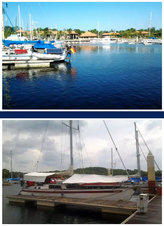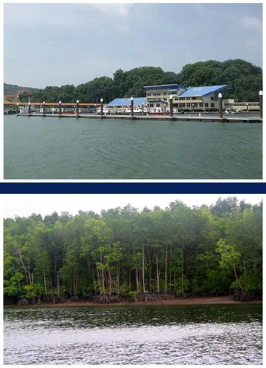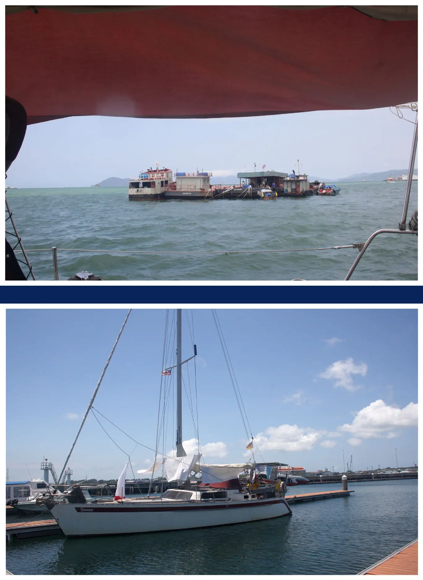 Wir klarierten also in Tanjung Pengileh ein, was wiederum außerhalb der Fährzeiten nicht ganz einfach ist. Am folgenden Tag fuhren wir vorbei an Mangrovenwäldern und Fischzuchtanlagen, in den Santi River ein und nach etwa 8 sm sahen wir Steuerbord die schön gelegene moderne Marina. Franz hatte mit Bedacht diesen Liegeort ausgewählt. Zum einen ist er kostengünstiger als vergleichbare Liegeplätze in Singapur und zum anderen, dem wohl wichtigere Grund, ist es das Süßwasser, in dem wir lagen und die salzwasserbedürftigen Pocken und Muscheln hatten keine Chance sich am Rumpf festzusetzen. Schließlich sollte hier die Samba ein halbes Jahr bis zur nächsten Reise ausharren. Das Sebana Cove Resort ist ein Bestandteil der gesamten Veränderungen im Distrikt des südlichen Johor. Ein riesiges Areal umfasst einen 18-Loch-Golfplatz, Hotelanlagen, botanischen Garten, Wohnsiedlungen, usw. Ein schönes weitläufiges Areal und alles noch im Bau.