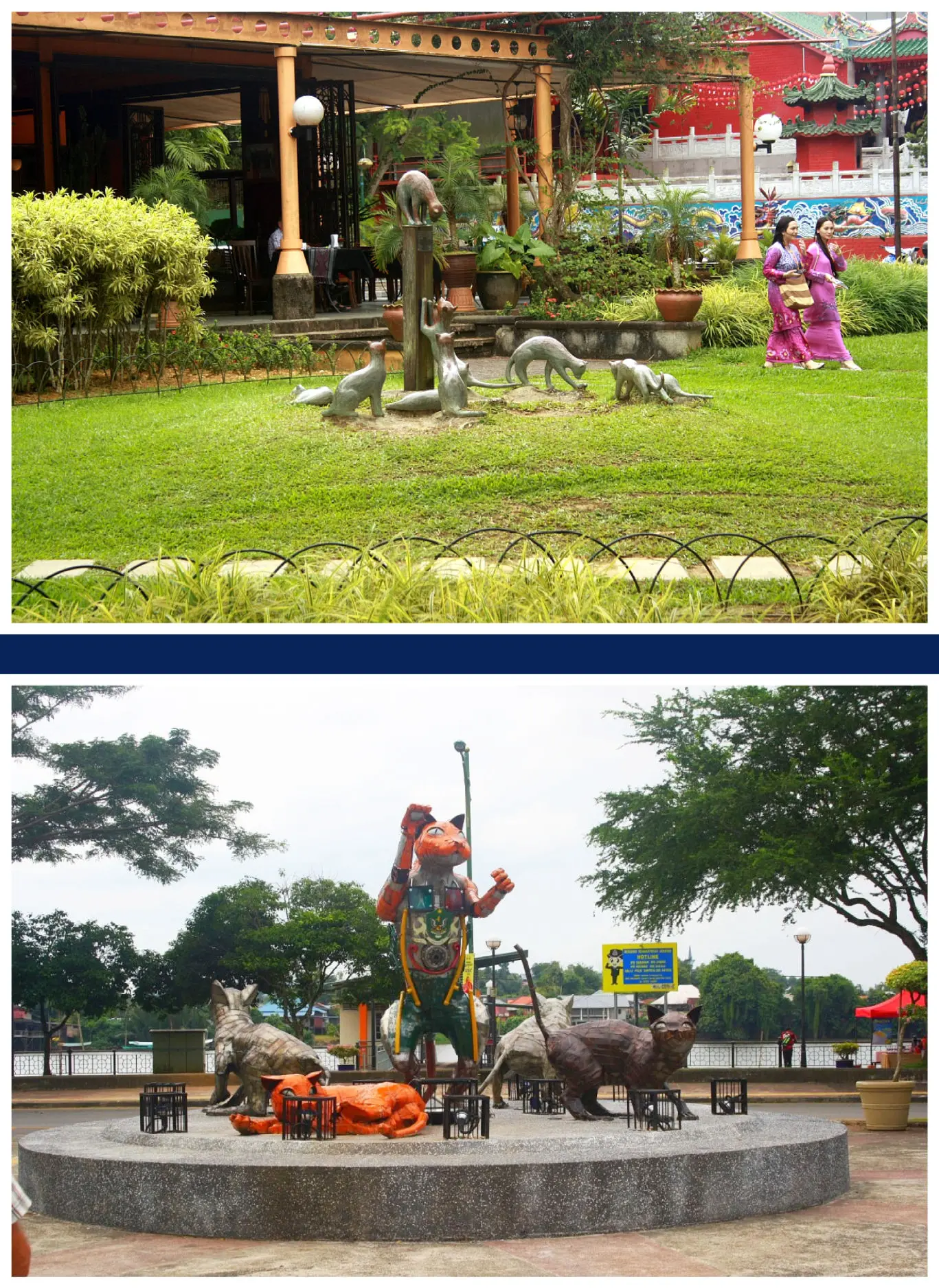 In Kuching ist alles für die Katz. Also den Katzen gewidmet. „Kucing“ ist das malaiische Wort für Katze. Einer schönen Geschichte folgend, kam der Abenteurer James Brooke 1839 auf seiner Yacht "Royalist" nach Kuching. Er fragte dann einen Einheimischen nach den Namen der Stadt. Der Einheimische dachte fälschlicherweise, dass Brooke auf eine Katze zeigen würde, und hatte „Kuching“ gesagt. Wahrscheinlicher ist, dass der Name von dem chinesischen Wort Kochin abgeleitet wird und der bedeutet „Hafen“, oder dass der Name nach der Mata Kuching (wörtl. „Katzenauge“) der „Katzenauge-Frucht", ein naher Verwandter der Litschi genannt wird. Bei uns ist sie als Longan bekannt. Sie hat einen süßen, sehr aromatischen Geschmack. Egal, die Katze ist zu einer Touristenattraktion geworden und wird entsprechend mit viel Kitsch vermarktet.