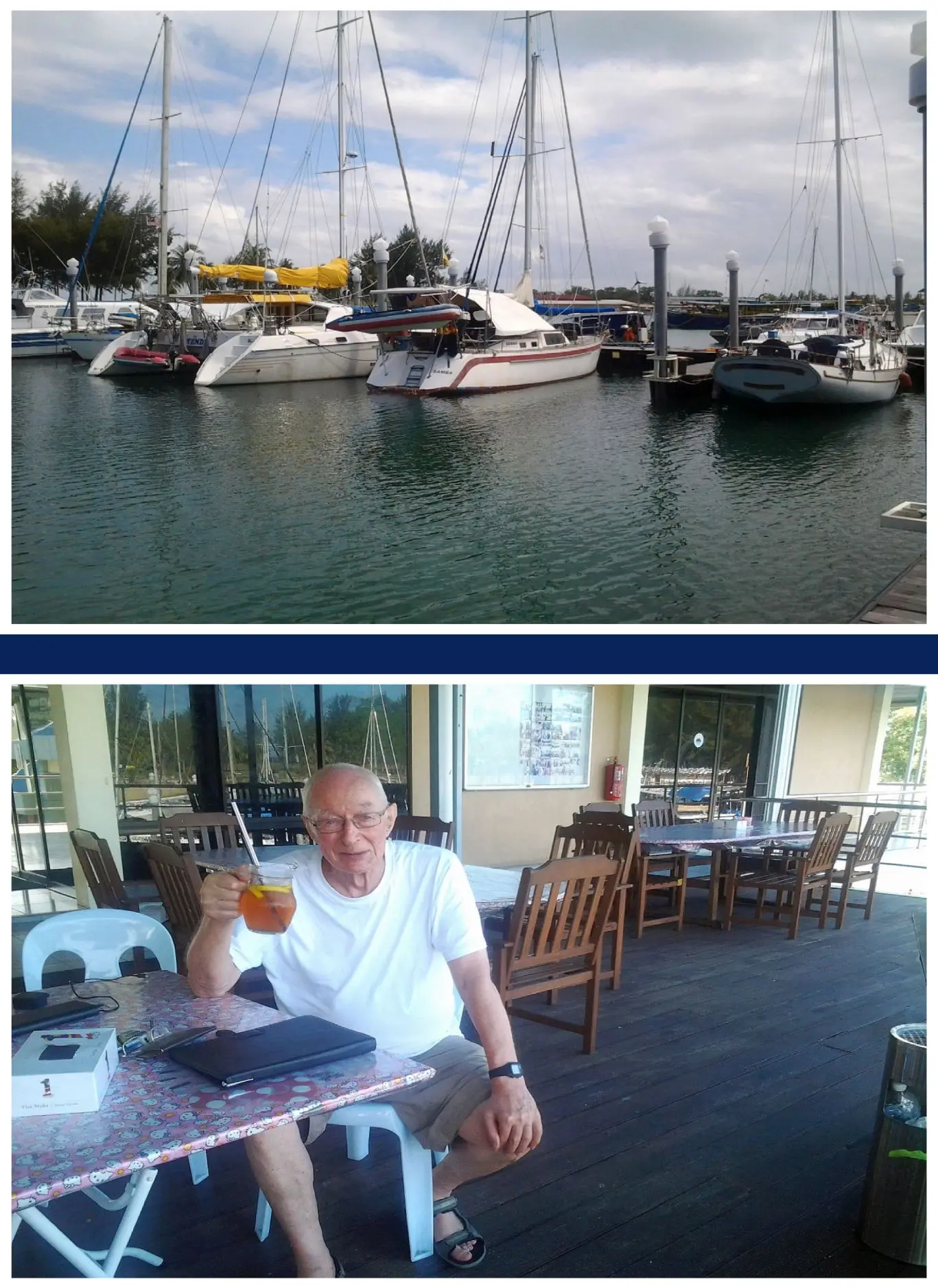geplanten Bebauung erahnen. Auf dem Fluss gibt es viel Treibgut und Müll und gelegentliches Holz. Wir hatten da einen Holzstamm, welcher bei Ebbe und Flut jedes Mal an der Bordwand vorbei rumpelte, nachdem er sich an den Pontons des Steges verfing. Franz Sorge galt zuerst das Dieseldefizit auszugleichen. Er lernte einen Australier namens Greg kennen, der mit seiner „Blue Destiny“ ebenfalls am Steg lag. Ein feiner Kerl, der schon längere Zeit hier festgemacht hatte. Er half den Diesel mit seinem Auto zu besorgen. Franz hat ihn zum Abendessen eingeladen und wir hatten einen vergnüglichen Abend bei Laksa und anderen Genüssen.