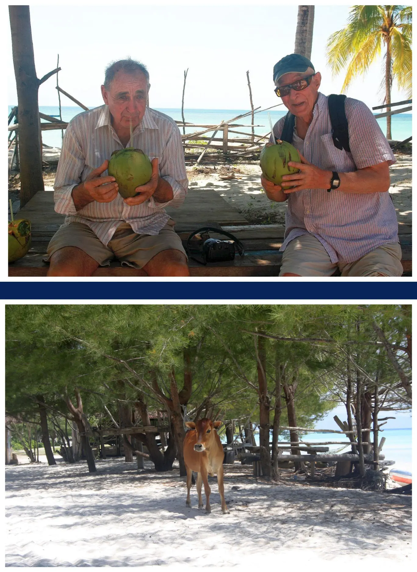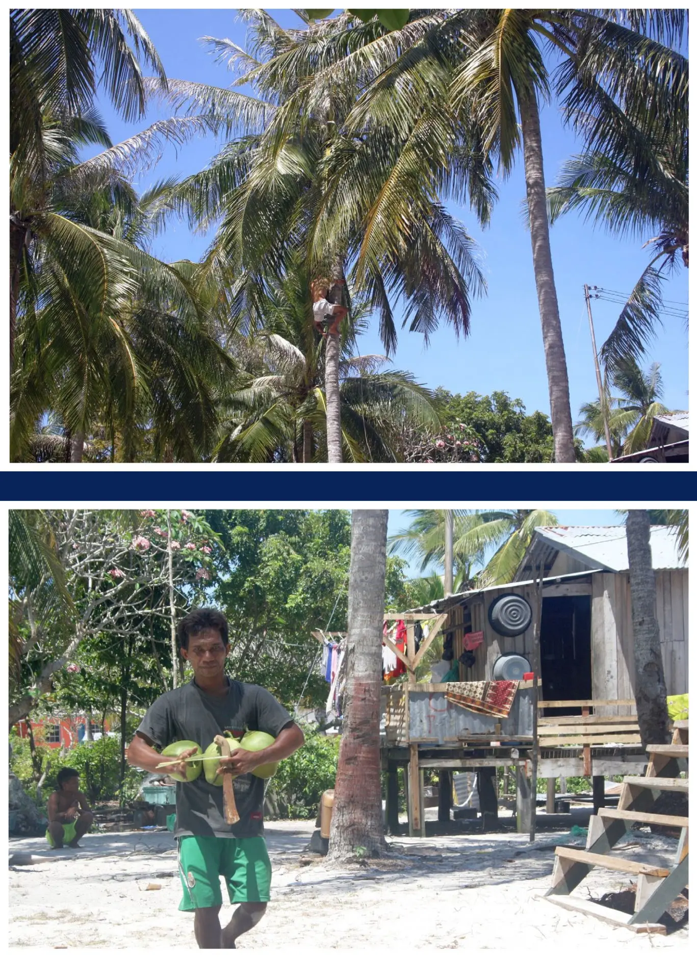Wir spazierten durch das Dorf, kauften im Laden Cola und Franz handelte einem jungen Mann eine Trinkkokosnuss für jeden ab. Na ja, die musste er aber erst von der Palme holen. Das ging ziemlich fix und ohne Sicherungsseil wuselte er die Kokospalme hoch und lies an einem mitgenommenen Seil ein Bündel Nüsse herunter, kletterte herab, nahm seine Machete, köpfte die Nüsse und überreichte jedem von uns grinsend eine Nuss mit Trinkhalm. Das Kokoswasser war überraschend kühl, der Geschmack angenehm, nicht zu süß und nicht zu sauer. Ich kannte das erfrischende Getränk schon aus Brasilien, eben ein idealer Durstlöscher.