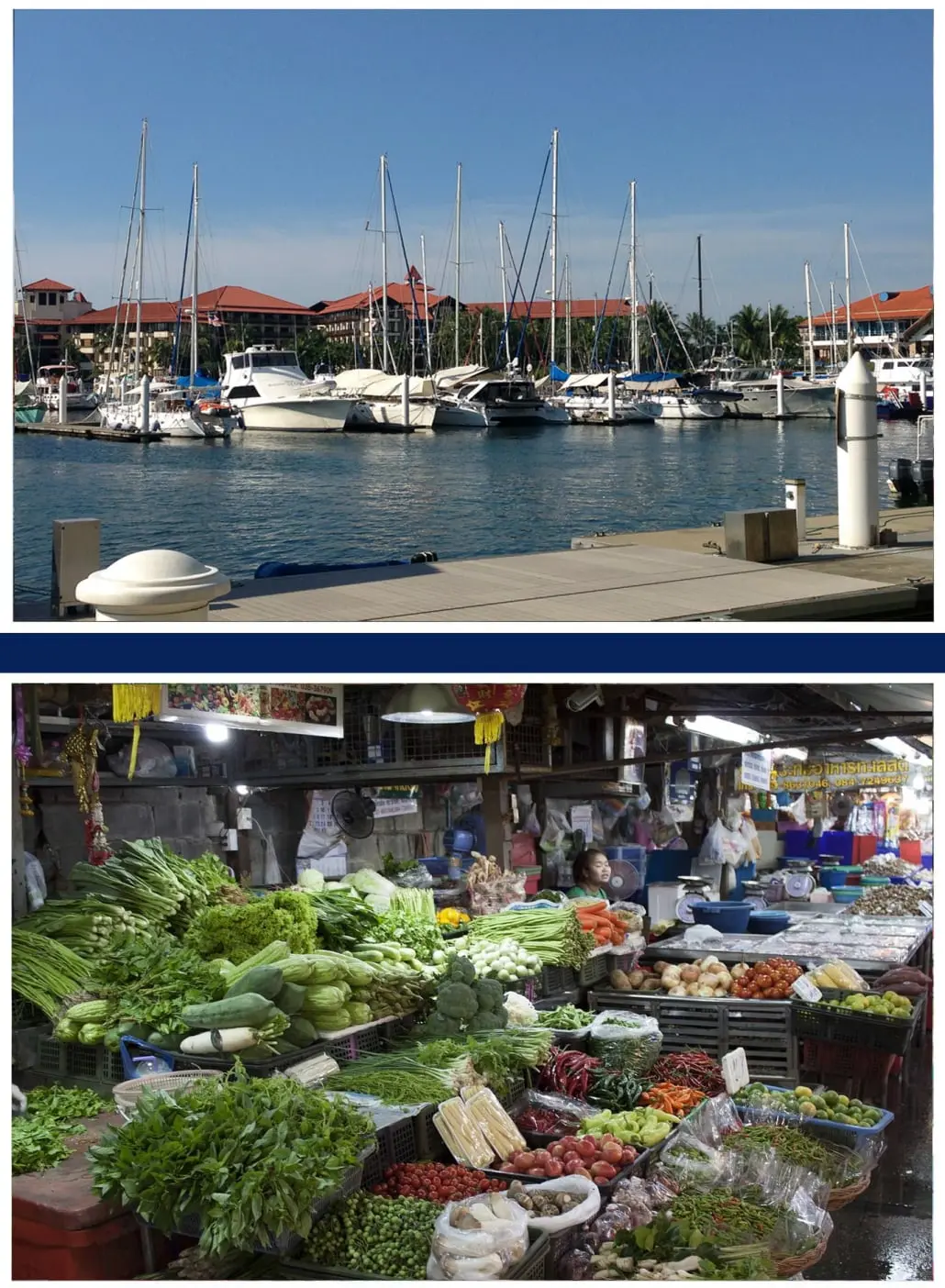Die Likas Bay ist eine mit Motorbooten stark befahrene Bucht. Deshalb holten wir das Tuch runter und motorten an einer Wassertankstelle (Quatsch, Tankstelle im Wasser), dem Kota Kinabalu Central Market und anderen Märkten zur Sutera Harbour Marina und Resort. O ha, eine Edelmarina. Die Ansteuerung war nicht schwierig. Jedenfalls war sie auf das Feinste ausgestattet und hatte alles, was das Herz eines Seglers erfreut. Entsprechend waren auch die Preise.