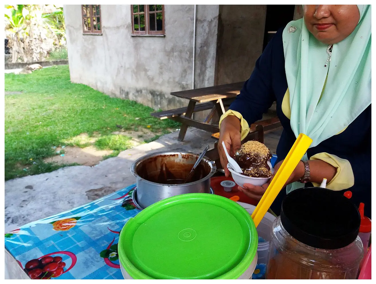 Bei unserem Spaziergang kamen wir auch an einem Grundstück vorbei, in dem hinter dem Gartenzaun, ein Gerät in einer Bude stand, was mich an eine Ständerbohrmaschine erinnerte. Eine freundliche junge Dame mit Hidschab erfüllte unseren Wunsch nach Eis, indem sie die Maschine anschmiss und von einem Eisblock auf dem Bohrständer Eissplitter abraspelte. Dieses verfüllte sie in Pappbecher, gab eine Schokoladensoße darüber und bestreute alles mit gehackten Nüssen. Na ja, es war mal etwas anderes, als Eis vom Italiener. Erst klebrig dann erfrischend als Durstlöscher, nachdem es aufgetaut war. Wir waren es zufrieden. Es musste ja nicht unbedingt das Eis von Schoeller oder Langnese sein. Übrigens versanken wir bei der Ansteuerung von Redang fast im Regen. Ein Film von Edi verdeutlicht das Geschehen.