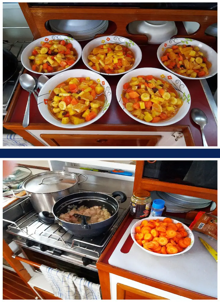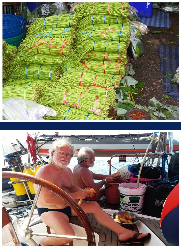 Zum Mittag bereitete ich immer, sofern wir nicht auf Landgang waren, einen Obstsalat zu. Mit dem hiesigen Obstangebot auf den Märkten oder Kaufhallen war das immer eine besondere Freude, da in ihm je nach Verfügbarkeit Melonen, Orangen, Bananen, Papayas, Äpfel, Mangos, Cherimoyas, Ananas, Pitahayas, Kakis usw. Verwendung fanden. Dazu einen Schuss Zitrone und nicht zu vergessen, einige Löffel in Rum eingelegte Rosinen (Kismis). Gewürzt habe ich mit einer Prise Zucker. Das war mit den reifen Früchten ein unvergesslicher Duft. Auf die Durianfrucht, auch unter der Bezeichnung Stinkefrucht bekannt, habe ich verzichtet. Das Risiko wegen Körperverletzung der Geruchsorgane in Ungnade zu verfallen, war doch zu groß. Schwieriger wurde es schon bei der Abendmahlzeit. Ich gab mir Mühe für Abwechslung zu sorgen. Also im Wechsel ein Kartoffel-, Reis- oder Nudelgericht und dazwischen auch mal einen Eintopf. Auf Konserven musste ich nur wenig zurückgreifen und wenn, dann nur als Ergänzung oder eben Tomatenstücken und Ketchup für diverse Soßen. Eine Besonderheit war der Bohneneintopf. Der war insofern kein Problem, da die hiesigen Bohnen Dimensionen hatten, dass das Schnippeln eine wahre Freude war. Ein Bündel dieser Bohnen reichte locker für eine Mahlzeit von fünf Personen. Allerdings war die Haltbarkeit auch von ihnen, wie bei allem Gemüse und Obst bei der Hitze und Luftfeuchtigkeit begrenzt. Jedenfalls musste ich aufpassen, dass nichts vergammelt und geschmissen werden musste. Die Zeit für die Vorbereitung und das Kochen musste ich so einrichten, dass spätestens bis 18:00 alle gegessen hatten und die Zeit für den sundowner blieb. Erleichtert wurde mir die Kocherei dadurch, dass ich gefrierge-trocknete Gewürze, wie Bohnenkraut für den Bohneneintopf, Basilikum für Bolognese und Dill für Berliner Schmorgurke und diverse Salate in reichlichen Mengen mitgebracht hatte. Dass mit den Salaten musste ich mir klemmen, denn grüne Salate sollten nur frisch verarbeitet werden und das ging beim besten Willen nicht. Aber Gurken- und Tomatensalat ging. Eine Gourmetküche konnte ich nicht bieten, aber ich denke, dass ich eine sättigende Hausmannskost hinbekommen habe und mich mit einigen Gerichten, wie Curryreis mit Chicken oder Chicken-Kokos-Curry mit Reis an die heimische Küche hielt.