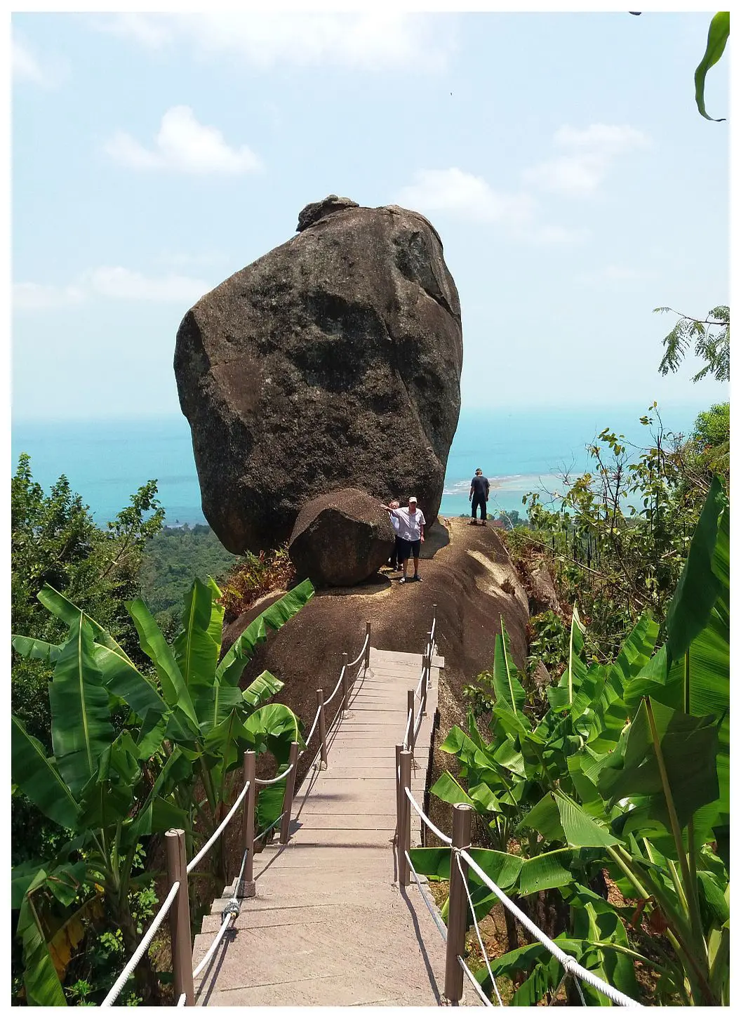 Franz führte uns in den darauffolgenden Tagen die tatsächlich sehenswerte Ferieninsel vor. Es gab da allerhand zu sehen und zu erleben. Also nicht nur die schönen Tempel, wie den Nara Charoen Suk, den Wat Khiri Wongkaram und den Big Buddha, die Lokale mit ihren lukullischen Genüssen, sondern auch Naturschönheiten mit fantastischen Aussichten auf die Inselwelt von Ko Samui. So besuchten wir die sogenannten Overlap Stone, einer der absoluten Top-Aussichtspunkte auf Koh Samui. Wir waren also fünf Personen im Auto. Herbert ist gefahren und ich muss sagen, dass er die kurvenreiche und unverschämt steile Straße (?) meisterhaft bewältigt hat. Ich war froh hinten zu sitzen und wäre auch gelaufen, wenn die anderen nicht so relaxt in der Gegend rumgeguckt hätten. Ich meine, dass Nahtoderfahrungen doch nicht so spannend sind, wie sie klingen. Oben angekommen erwarteten uns nach einem kurzen Fußweg durch den Dschungel die faszinierenden Overlap Stone, sowie ein traumhafter Ausblick auf die Südküste von Koh Samui. Der atemberaubende Blick entschädigt sofort für die doch recht spektakuläre Fahrt. Der Felsen selbst ist unglaublich. Es ist ein riesiger abgerundeter Stein, der scheinbar wacklig auf einem anderen ruht. Und oben auf ihm lümmelt noch ein kleiner herum. Es ist eine unglaubliche Felsformation und ich bin froh, dass ich dabei war.