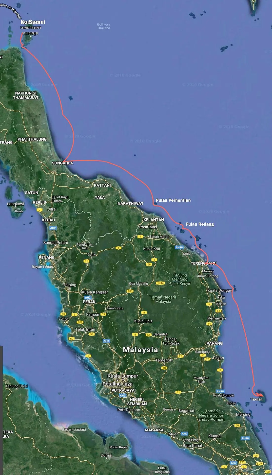 Entlang der Ostküste von Thailand und Malaysia von Ko Samui nach Tioman. Der Golf von Thailand ist eine wenig für Europäer touristisch erschlossene Gegend. Dafür aber nicht weniger schön und erlebnisreich als die Westküste mit Malakka, Penang, Langkawi und Phuket.