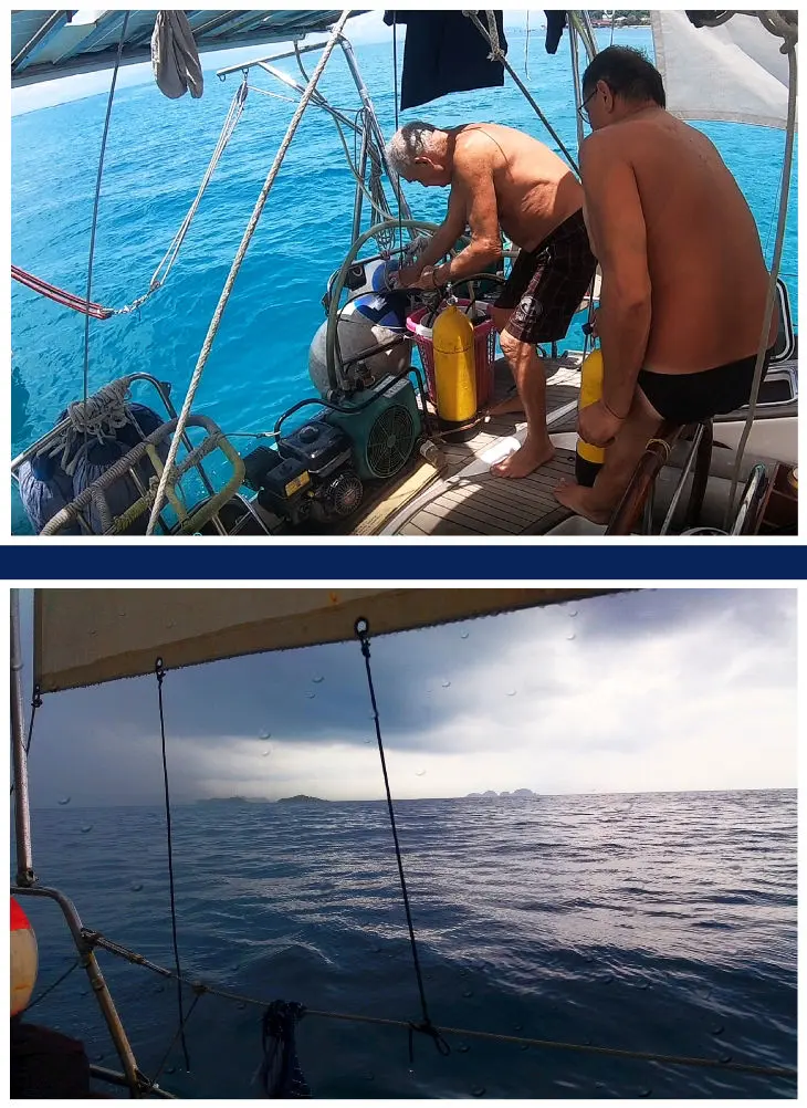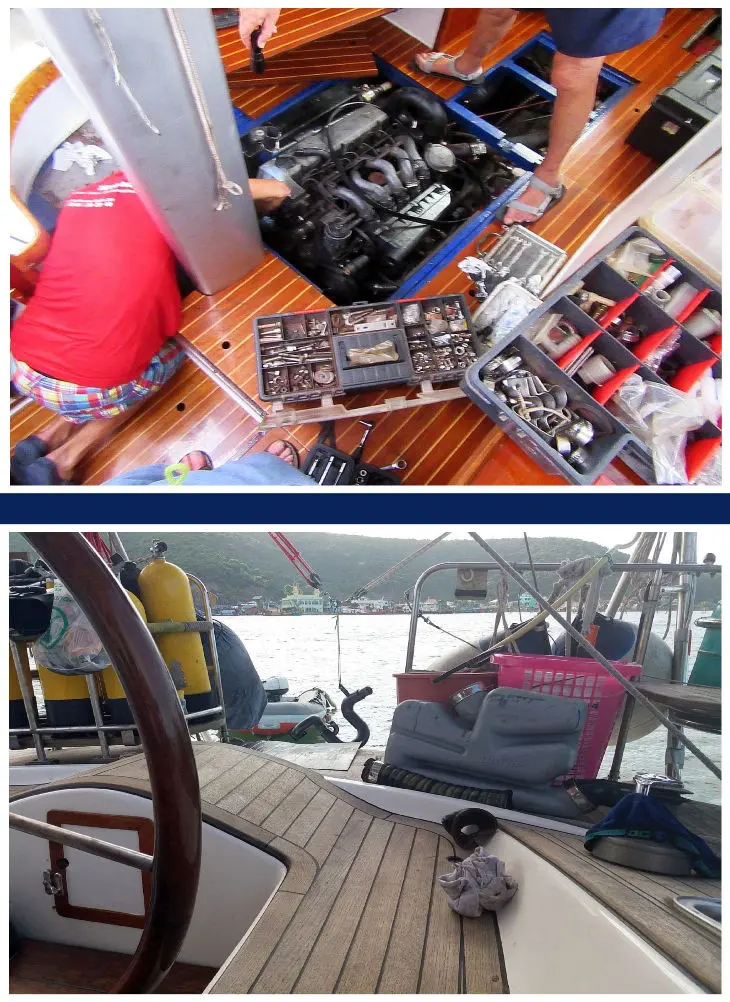 Wir richteten uns notwendigerweise für die kurze Zeit unseres Aufenthaltes ein und bereiteten alles gründlich für unsere eigentliche Reise vor. Das war nicht nur das aufwendige Bunkern von Diesel, die Besorgung der restlichen Lebensmittel, das gründliche Reinigen des Schiffes, sondern auch die Überprüfung der Maschine. Diese benahm sich zu dieser Zeit noch recht friedlich und wir ahnten nicht, was das Ding uns noch für Probleme machen sollte. Zwar war die SAMBA in Phuket einer gründlichen Renovierung unterzogen, von der aber die Maschine ausgenommen war. Herbert sorgte sich sehr für unsere Sicherheit und beseitigte die übelsten Fallen auf den Decks der Schrottboote, über die wir alles Benötigte an Bord bringen mussten. Es war eine arge Schlepperei, besonders mit den schweren Dieselkanistern. Aber wir wollten es so und bewältigten alles klaglos.
