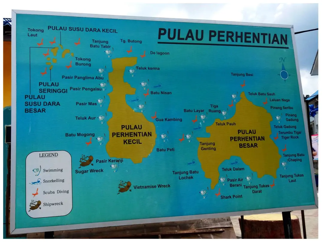 Wie überall in Südostasien gibt es viele Legenden und Märchen. Die meisten handeln, wie kann es anders sein, von Prinzessinnen, Prinzen, bösen und guten Geistern sowie diversen Dämonen. So auch hier, denn der Legende nach ist Tioman Island der Ruheplatz einer schönen Drachenprinzessin. Während sie ihren Prinzen in Singapur besuchte, erhielt diese wunderschöne Jungfrau Trost im kristallklaren Wasser des Südchinesischen Meeres. Von den Reizen des Ortes begeistert, beschloss sie, ihre Reise zu unterbrechen. Indem sie die Form einer Insel annahm, versprach sie, vorbeikommenden Reisenden Schutz und Komfort zu bieten. Zu erkennen sei das an zwei Bergspitzen, die im Süden der Insel in den Himmel ragen und die Tioman unverkennbar machen. Gemäß der lokalen Legende sind die rund 700 Meter hohen Gipfel die Hörner der eingeschlafenen Drachenprinzessin, welche heute die Ferieninsel bildet. Es sind die Felsengipfel Gunung Kajang und Bukit Nenek Simukut. Also es gehört schon eine Menge Sang Som (ein Thai Rum) dazu, um in der Insel eine Drachenprinzessin und auch noch dazu eine Jungfrau zu erkennen. Na ja, die Hitze. Die beiden Felsen sahen wir erst bei unserer Überfahrt nach Tanjung Gemok, als wir noch mal zurückblickten. Tioman ist wirklich eine der schönsten Inseln Malaysias.