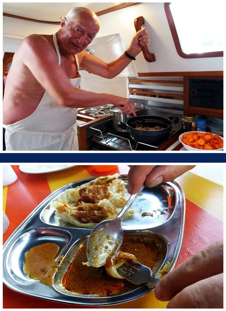 An Laksa, dieser scharfen wohlschmeckenden Nudelsuppe mit diversen Einlagen und seinen unendlichen Variationen habe ich mich nicht getraut. Dazu bedarf es der langjährigen Ausbildung einer malaysischen Hausfrau. Es hat ja jeder seine Kochgewohnheiten und beherrscht eine bestimmte Anzahl von Rezepten. Aber das, was zu Hause in der Küche geht, funktioniert auf dem Schiff nur eingeschränkt. Jeder, der in die Lage versetzt wurde, eine Crew zu bekochen, wird mir das bestätigen. Außerdem kommen hier noch die manchmal doch sehr einschränkenden Umstände, wie die Beschriftung auf Verpackungen hinzu. Manchmal in Englisch, aber zu meist in der Landessprache. Kalligrafisch wunderschön, aber für mich das Buch mit den sieben Siegeln. Hinzu kommt, dass die Geschmäcker unterschiedlich sind und es ein schwieriges Unterfangen ist, es allen recht zu machen. Ich hoffe im Stillen noch, dass mir das gelungen ist. Der Eine lächelt und lobt, der Andere löffelt still in sich hinein und schweigt. Hat das nun geschmeckt oder nicht? Walter konnte es nicht scharf genug sein, Franz sagte, etwas weniger Chili. Walter sagt viel mehr. Jedes Kochen ist eine Gratwanderung. Also ist ein Kompromiss angesagt.