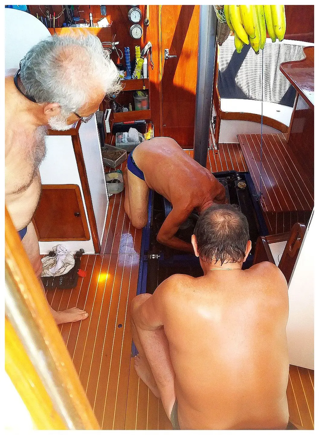 Damit nun verhindert wird, dass Seewasser über den Auspuff zurück zum stehenden Motor gelangt, was der Muffler u. a. unterbindet, hat Walter mit einer tollen Schnitzarbeit einen Stopfen hergestellt, der nun jedes Mal, wenn die Maschine aus gemacht wurde, hinten in den Auspuff gekloppt werden musste. Es gab also neue Kommandos: „Maschine aus – Stopfen rein!“, „Maschine an – Stopfen raus!“. Ein langer Probelauf ergab, dass nun endlich die Kühlkreisläufe von See- und Süßwasser dicht waren und die Bilge trocken blieb. Aber es war noch nicht das Ende der Fahnenstange.