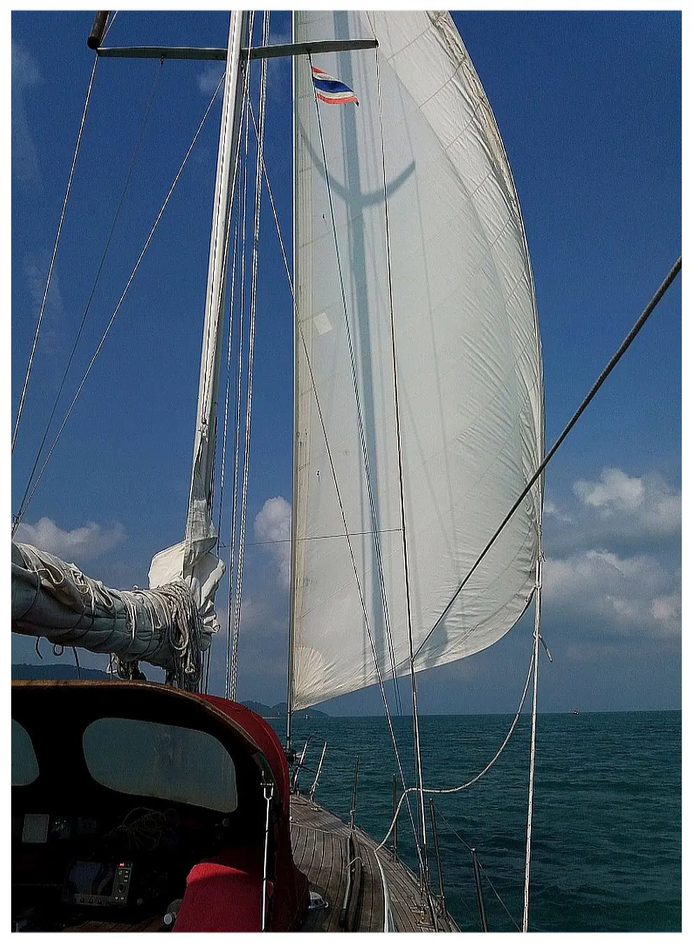 Es war alles andere als eine Schönwetterlage. Regenböen weichten an Deck alles ein und der Wind machte auch so seine Spielchen. Mal kam er aus Ostnordost, dann aus Ostsüdost. Manchmal blieb er im Regen ganz weg. Die Wellen wussten auch nicht mehr so richtig wo sie her- und hinsollten und so entstand ein sehr chaotisches Wellenmuster. Die eine oder andere Kreuzsee war wohl auch höher als 2 m. Für die Nacht wurde das dritte Reff am Groß angeschlagen und mit einem wachsamen Auge auf die vielen Fischerboote dämmerte ein feuchtwarmer Morgen herauf. Das Wetter hatte im Laufe des frühen Morgens beruhigt und gegen Mittag klarte es auf, der Wind blies gleichmäßig mit 3 – 4 bft nach Ostsüdost, es war eine schöne flotte Fahrt und mit Einbruch der Dunkelheit erreichten wir die Einfahrt nach Songkhla. Die Einfahrt zu unserem Ankerplatz war nicht ganz einfach und erforderte auch wegen der vorgelagerten Inseln alle Aufmerksamkeit. Eine Marina gab es nicht und so suchte der Skipper einen Ankerplatz in der viel befahrenen Durchfahrt vor einigen Stellnetzen. Diese Durchfahrt ist eine Meerenge, welche den Thale Sap, eine große Lagune, mit dem Meer verbindet. Dieses Manöver verkomplizierte sich zusätzlich, da in der Einfahrt der Gashebel der Maschine nicht mehr wollte, wie er sollte. Das Kugelnippel an der Maschine war abgegangen. Kleine Fahrt ging noch, was gerade noch ausreichte. Das war der Anfang von vielen kleinen und größeren Defekten und kostete die Reparateure bei dem tropischen Klima viel Schweiß und Anstrengung. Bedeutete es doch jedes Mal, wenn ein Teil seinen Geist aufgab, im Salon die Polster wegzuräumen, den Tisch abzuschrauben und hochzuklappen. Das war aber nur die Vorbereitung, denn dann kam die eigentliche Arbeit. Damit begann der eigentlich verrückte Teil unseres Törns. Ach so, die schon gewohnte Begleitmusik militärischen Tuns hatten wir auch wieder. Eine viertel Meile entfernt befand sich die Songkhla Naval Base. Ein Marinestützpunkt der etwas größeren Art. Auf der sich, wie schon bekannt, um 6:00 Uhr und um 18:00 Uhr das lautstarke militärische Ritual des Fahnenappells stattfand. Viel Schiffe, viel gepfoffe.