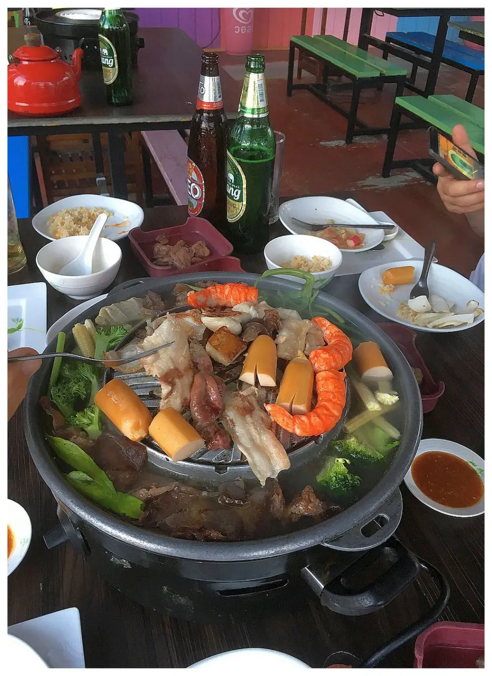 Natürlich auch die eingeschweißten Würstchen, in deren Brät allerdings mehr Tofu als Fleisch sein dürfte. Egal, sie haben gebraten, das Frühstück bereichert. Das Schöne an der Sache war, dass ich unterwegs immer mal wieder dieses und jenes ergänzen konnte. Ich habe ja nicht immer gekocht. Wir waren, wenn die Gelegenheit gegeben, auch an Land essen. Das ist in dieser Region immer ein Erlebnis und Franz kannte die einschlägigen Lokalitäten. Eben auch wieder in einem Steam Boot-Restaurant mit allem was dazu gehört. Fast ein Ritual zu dem man Ruhe und Zeit braucht, nicht nur um seine Meeresfrüchte und Fleischstücken zu garen, sondern auch zu verhindern, dass sie einem geklaut werden. Die Zeit und Muße hatten wir, was uns bei Chang nicht schwer fiel.
