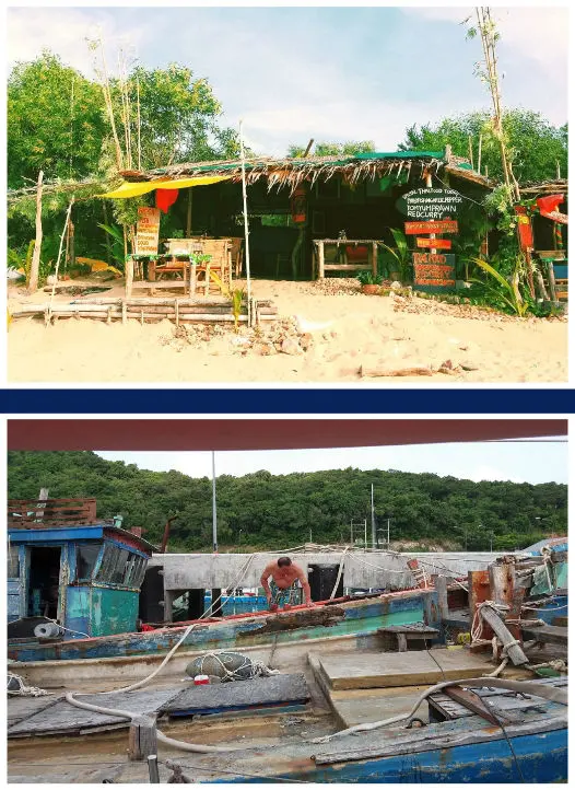 Inzwischen war es Nachmittag geworden und mich erreichte überraschenderweise die Mail von Franz, dass er mich doch noch heute abholen wolle, da die SAMBA für die neue Crew vorbereitet sei. Prima. Also vorzeitig auschecken und im Lokal Wartestellung beziehen. Die Abordnung, welche mich abholte, hat mich doch erstaunt. Franz und Silja hatten Herbert vom Flugplatz abgeholt und lasen mich unterwegs mit auf. Mir war es recht, mein bequemes klimatisiertes Hotelbett hinter mich zu lassen und die Koje auf dem Schiff zu beziehen. Die SAMBA lag vor Anker nur zwei Buchten weiter. Der Weg zum Sandstrand von Mae Nam war ebenso abenteuerlich, wie die Fahrt zum Schiff, das Lokal „Jamaica Bar“, welche wir noch oft besuchten und die Aussicht auf Kommendes. Wir verbrachten, nachdem wir uns kurz eingerichtet hatten, sehr gut bewirtet, einen schönen Abend. Ich atmete tief durch; endlich am ersehnten Ziel und ich war zutiefst mit mir und meiner Umwelt zufrieden. Silja feierte ihren Abschied, denn sie verließ uns am kommenden Tag in guter Hoffnung, auch um heil zu Hause anzukommen.