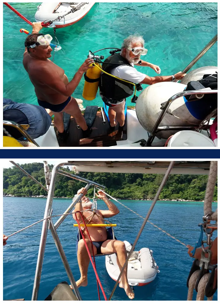 Wie immer gab es kleine Reparaturen. Diesmal wurde zur Freude und unter Anteilnahme aller, Walter im Bootsmannstuhl mit einem Fall an einem der Davits des Dingi hochgezogen, um dort eine Talje zu reparieren. Die Reparatur wurde ebenfalls als Manöver anerkannt und der Erfolg gebührend mit einem kräftigen Schluck aus der Pulle gewürdigt. Was für unbeschwerte Stun-den, welche wir die letzten Tage, bevor es hieß Abschied zu nehmen, verbrachten. Gemütlich am Morgen ausschlafen, danach den Tag mit einer längeren Schwimmeinheit im glatten Wasser in der Bucht beginnen – das hat was! Zu unserer Freude hat Herbert schöne Bilder aus der Unterwasserwelt mitgebracht. Ein Film von Walter verdeutlicht das Geschehen. Nun hieß es erst einmal auf Tioman einklarieren. Mächtige Berge mit einer Höhe bis zu etwa 1000 m ließen die Insel schon von weitem erkennen. Die Insel selbst ist ein Naturreservat, bedeckt mit tropischem