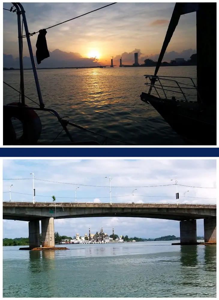 Den einzig schönen Ausblick hatte ich durch den Brückenbogen auf die Kristallmoschee, die "Masjid Kristal". Die Kristallmoschee, glitzernd, glamourös und modern, war für mich nur ein Blick auf die unendliche Geschichte des Islam. Sie wird auch als schwimmende Moschee bezeichnet, was so nicht stimmt, denn sie ruht auf Pfählen und ist fest verankert im Fluss. Wäre auch blöd, wenn die Betenden Seekrank wegen der Schaukelei würden. Weiter möchte ich das Thema nicht vertiefen. Aber wir mussten weiter, denn die Zeit drängte. Franz plante vorausschauend, denn in Tioman angekommen, war es nicht so, nur einfach Tschüss zu sagen, sondern die SAMBA musste noch für eine längere Liegezeit vorbereitet werden. Trotzdem wollten wir noch unseren Törn genießen. Und das taten wir auch und nahmen Kurs auf die etwa 50 sm entfernte Insel Pulau Tenggul. Der Wind kam schwach aus Ost und reichte für ein Vorwärtskommen nicht aus, als wir die Maschine, noch in Sicht von Terengganu, ausmachen mussten, um so ein undichtes Gummidingens in der Zuleitung des Kühlwassers auszutauschen. Franz gingen so langsam die Ersatzteile aus und so wurde ein altes Teil notdürftig repariert.