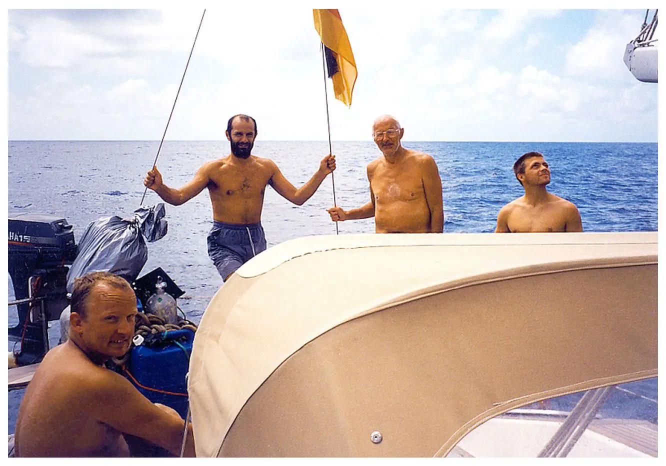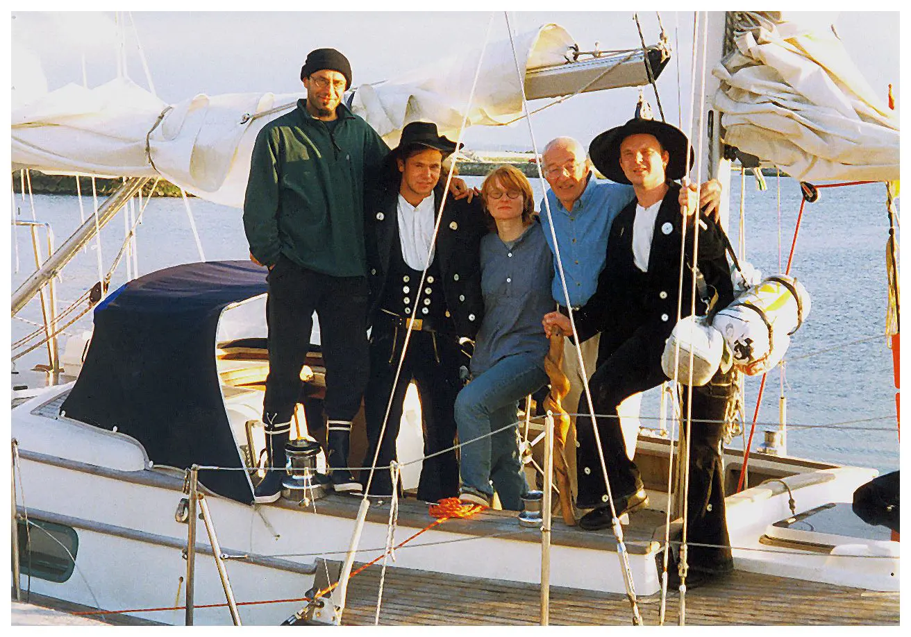 1997 von Minde (Dänemark) über Cuxhafen nach Las Palmas (Gran Canaria) begleiteten uns von Holland bis Portugal auch zwei Handwerksburschen (Zimmerleute) aus Österreich, welche sich auch mit viel Geschick an Holzarbeiten am Schiff beteiligten und ansonsten unglaublich fleißig waren. Alle Hand gegen Koje bis auf den Skipper Antonio (links im Bild). Sie verließen uns in Porto. Schließlich mussten sie wandern und nicht segeln. Ihr Ziel war Südamerika. Von links nach rechts: Antonio, Waldi, Hanna, ich und Peter.