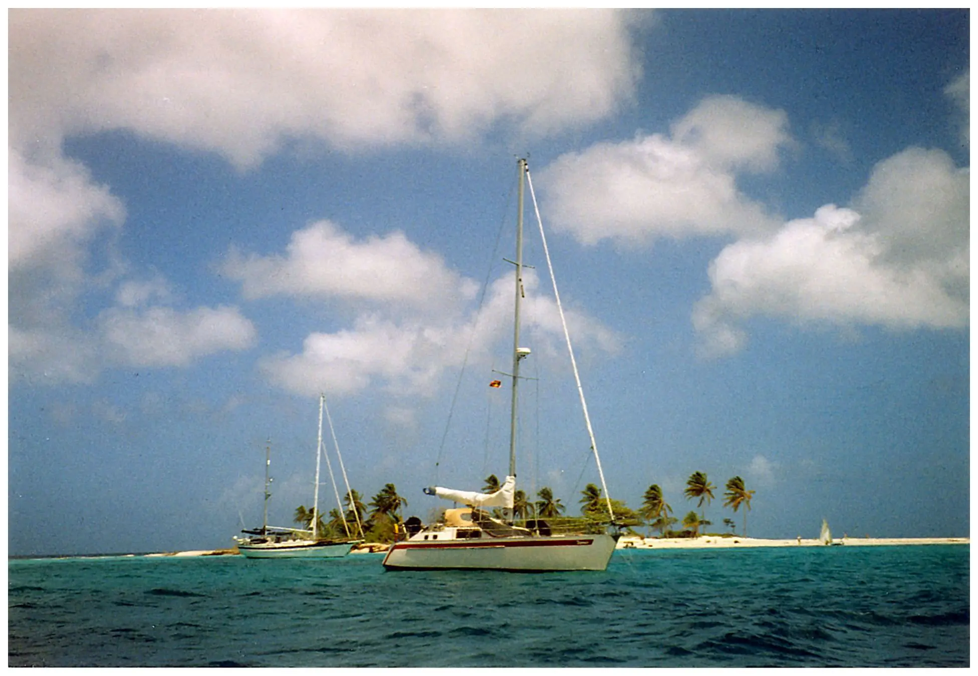 Die "SY SAMBA" vor Sandy Island. Sie ist eine kleine, zu Grenada gehörende unbewohnte Insel der Kleinen Antillen in der Karibik direkt vor der Nordwestküste der Insel Carriacou. Romantik pur.